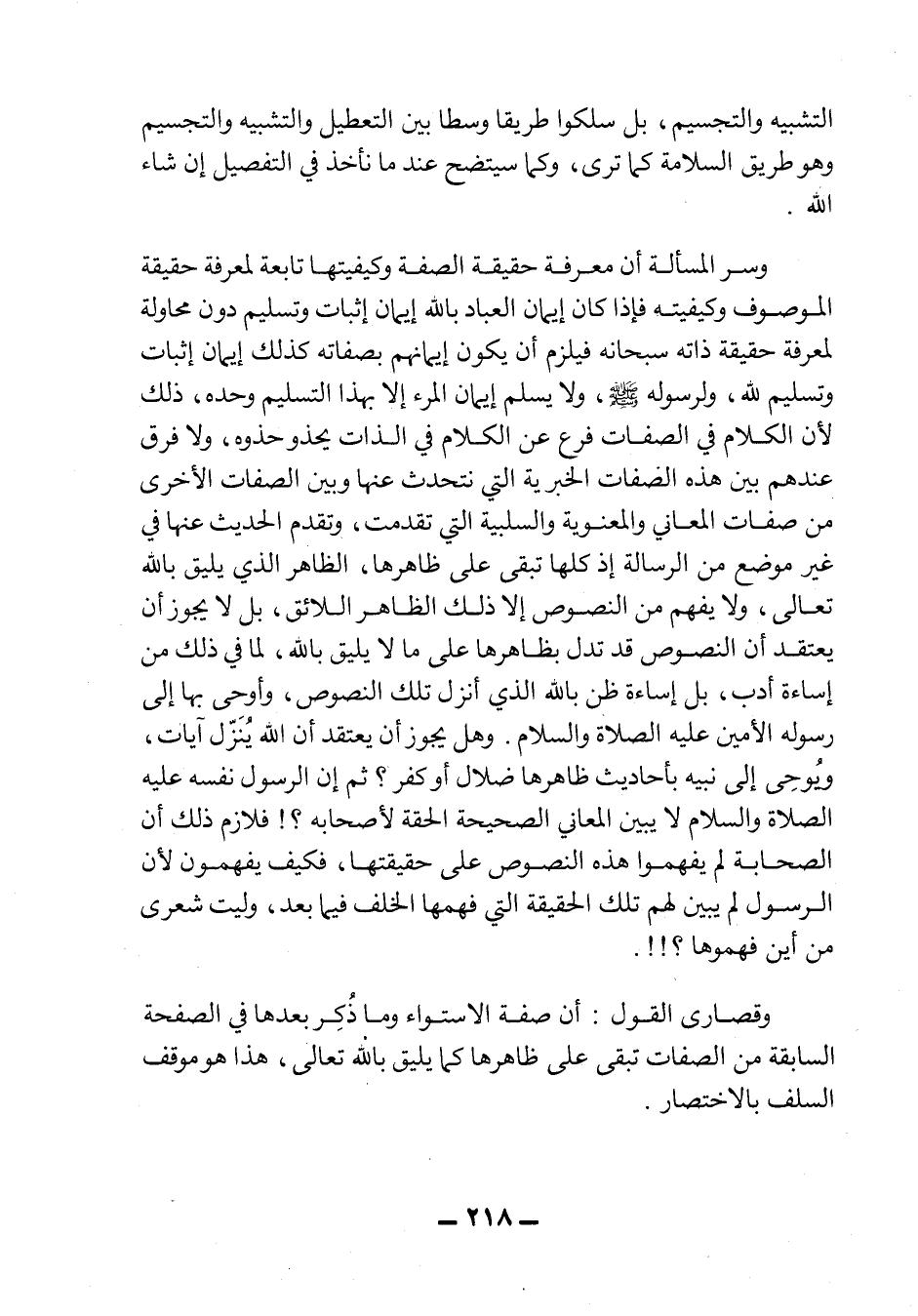 وقصارى القول: أن صفة الاستواء وما ذُكر بعدها في الصفحة السابقة من الصفات تبقى على ظاهرها كما يليق بالله تعالى، هذا هو موقف السلف بالاختصار.