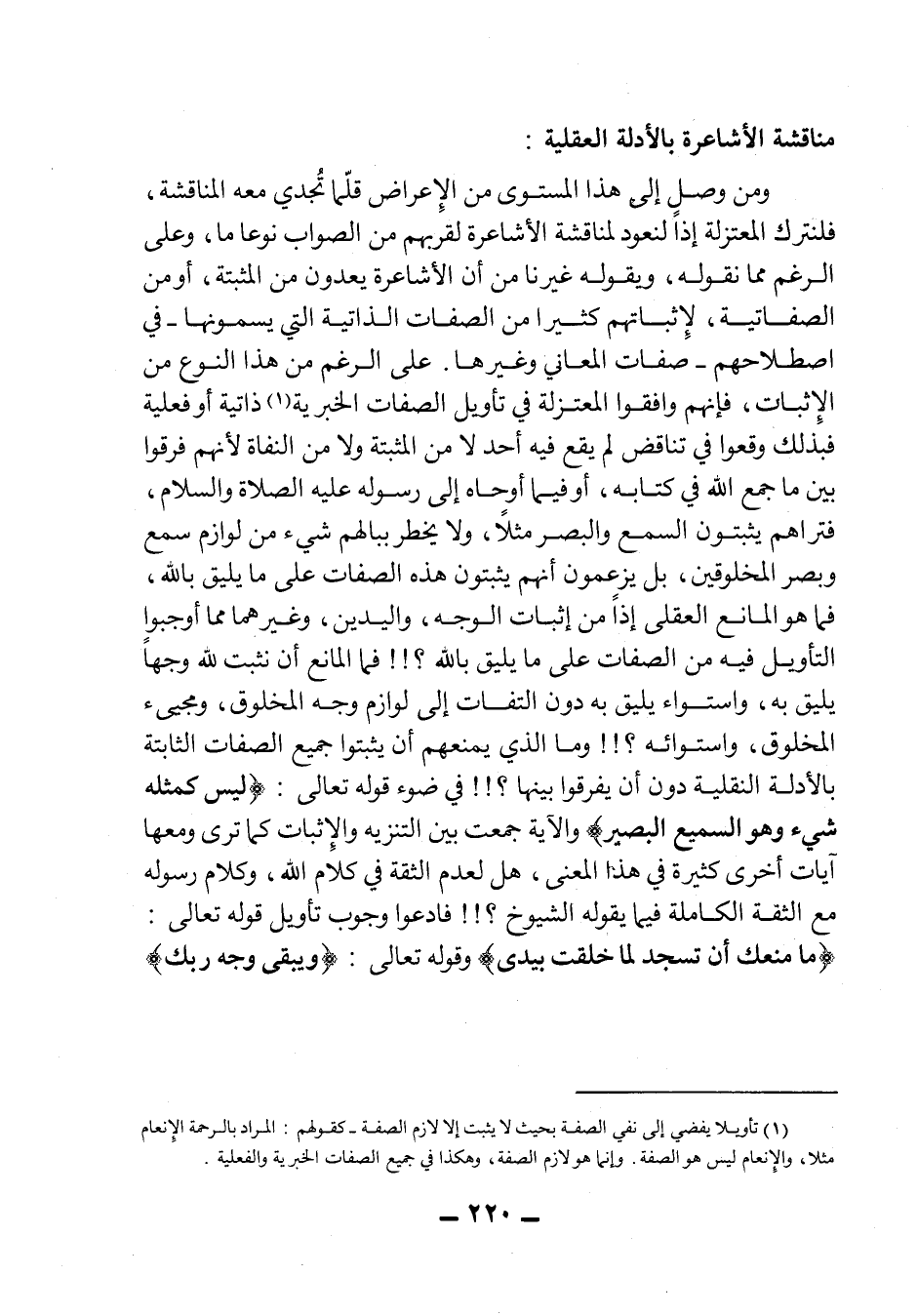 ومن وصل إلى هذا المستوى من الإعراض، قلّما تجدي معه المناقشة، فلنترك المعتزلة إذاً لنعود لمناقشة الأشاعرة لقربهم من الصواب نوعاً ما، وعلى الرغم مما نقوله، ويقوله غيرنا من أن الأشاعرة يعدون من المثبتة، أو من الصفاتية، لإثباتهم كثيراً من الصفات الذاتية التي يسمونها - في اصطلاحهم- صفات المعاني وغيرها. على الرغم من هذا النوع من الإثبات، فإنهم وافقوا المعتزلة في تأويل الصفات الخبرية1، ذاتية أو فعلية فبذلك وقعوا في تناقض لم يقع فيه أحد لا من المثبتة ولا من النفاة، لأنهم فرقوا بين ما جمع الله في كتابه، أو فيما أوحاه إلى رسوله عليه الصلاة والسلام، فتراهم يثبتون السمع والبصر مثلاً، ولا يخطر ببالهم شيء من لوازم سمع وبصر المخلوقين، بل يزعمون أنهم يثبتون هذه الصفات على ما يليق بالله، فما هو المانع العقلي إذاً من إثبات الوجه، واليدين، وغيرهما مما أوجبوا التأويل فيه من الصفات على ما يليق بالله؟!! فما المانع أن نثبت لله وجهاً يليق به، واستواء يليق به دون التفات إلى لوازم وجه المخلوق، ومجيء المخلوق، واستوائه؟!! وما الذي يمنعهم أن يثبتوا جميع الصفات الثابتة بالأدلة النقلية دون أن يفرقوا بينها؟!! في ضوء قوله تعالى: {لَيْسَ كَمِثْلِهِ شَيْءٌ وَهُوَ السَّمِيعُ البَصِيرُ} ، والآية جمعت بين التنزيه والإثبات كما ترى ومعها آيات أخرى كثيرة في هذا المعنى، هل لعدم الثقة في كلام الله، وكلام رسوله مع الثقة الكاملة فيما يقوله الشيوخ؟!! فادعوا وجوب تأويل قوله تعالى: {مَا مَنَعَكَ أَن تَسْجُدَ لِمَا خَلَقْتُ بِيَدَيَّ} ، وقوله تعالى: {وَيَبْقَى وَجْهُ رَبِّكَ}