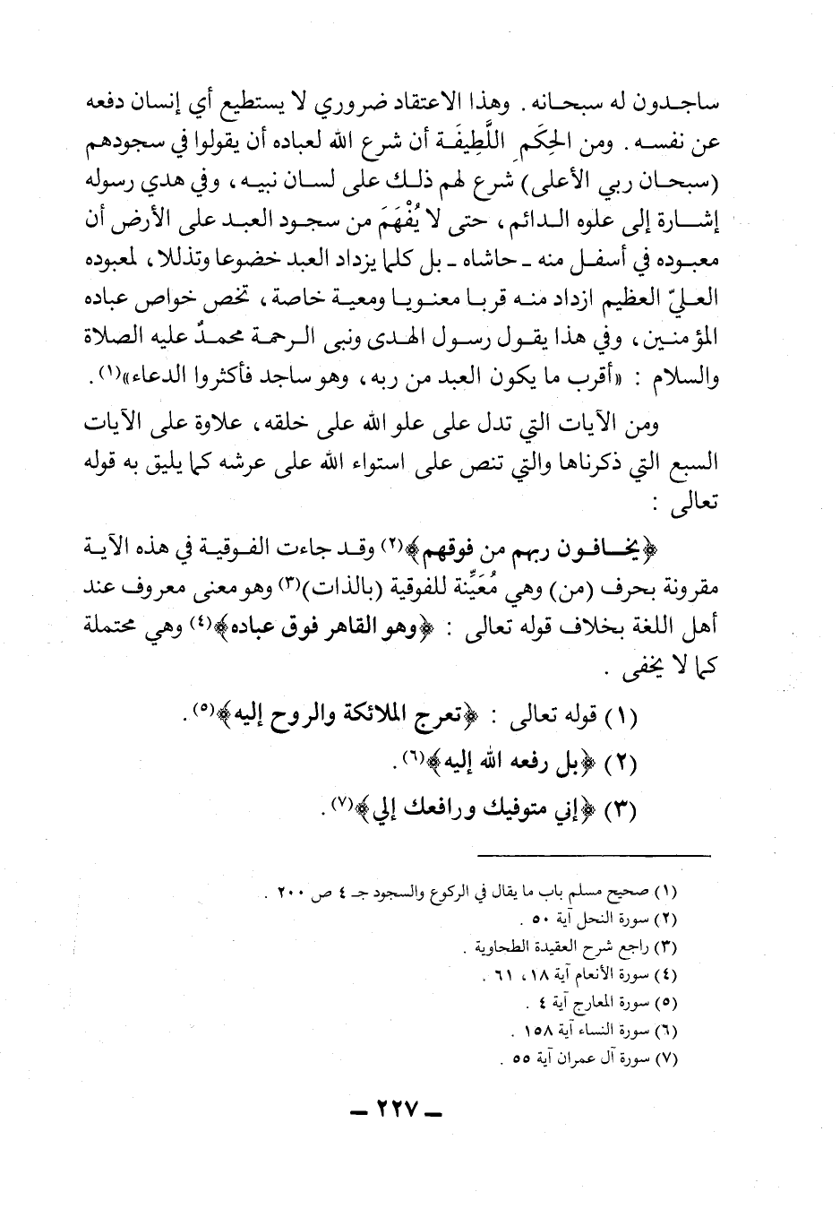 ساجدون له سبحانه. وهذا الاعتقاد ضروري لا يستطيع أي إنسان دفعه عن نفسه، ومن الحِكَم اللطيفة أن شرع الله لعباده أن يقولوا في سجودهم: "سبحان ربي الأعلى" شرع لهم ذلك على لسان نبيه، وفي هدي رسوله إشارة إلى علوه الدائم، حتى لا يفهم من سجود العبد على الأرض أن معبوده في أسفل منه – حاشاه - بل كلما يزداد العبد خضوعاً وتذللاً، لمعبوده العلي العظيم ازداد منه قرباً معنوياً ومعية خاصة، تخص خواص عباده المؤمنين، وفي هذا يقول رسول الهدى، ونبي الرحمة محمد عليه الصلاة والسلام: "أقرب ما يكون العبد من ربه، وهو ساجد فأكثروا الدعاء" 1.