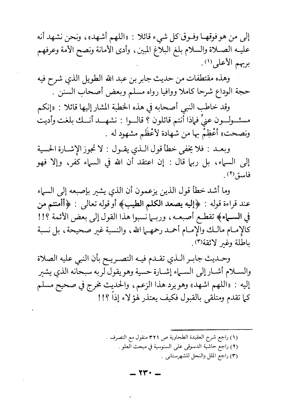 وحديث جابر الذي تقدم فيه التصريح بأن النبي عليه الصلاة والسلام أشار إلى السماء إشارة حسية، وهو يقول لربه سبحانه الذي يشير إليه: "اللهم اشهد"، وهو يرد هذا الزعم، والحديث مخرج في صحيح مسلم كما تقدم، ومتلقى بالقبول فكيف يعتذر لهؤلاء إذاً؟!!