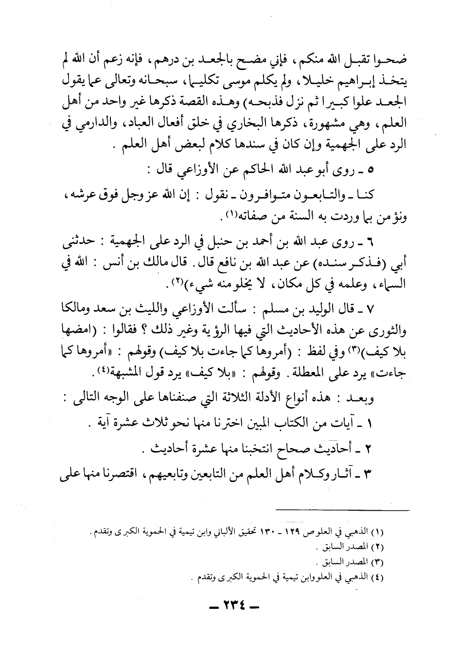 7- قال الوليد بن مسلم: سألت الأوزاعي والليث بن سعد ومالكاً والثوري عن هذه الأحاديث التي فيها الرؤية وغير ذلك؟ فقالوا: "امضها بلا كيف"3، وفي لفظ: "أمروها كما جاءت بلا كيف"، وقولهم: "أمروها كما جاءت" يرد على المعطلة. وقولهم: "بلا كيف" يرد قول المشبهة4.