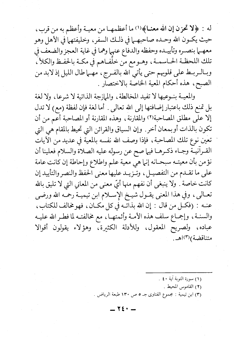 والمعية لنوعيها لا تفيد المخالطة، والممازجة الذاتية لا شرعاً، ولا لغة بل تمنع ذلك باعتبار إضافتها إلى الله تعالى. أما لغة فإن لفظة (مع) لا تدل إلا على مطلق المصاحبة2 والمقارنة، وهذه المقارنة أو المصاحبة أعم من أن تكون بالذات أو بمعان أخر، وإن السياق والقرائن التي تحيط بالمقام هي التي تعين نوع تلك المصاحبة، فإذا وصف الله نفسه بالمعية في عديد من الآيات القرآنية وجاء ذكرها فيما صح عن رسوله عليه الصلاة والسلام فعلينا أن نؤمن بأن معيته سبحانه إنما هي معية علم واطلاع وإحاطة إن كانت عامة على ما تقدم من التفصيل، وتزيد عليها معنى الحفظ والنصر والتأييد إن كانت خاصة. ولا ينبغي أن نفهم منها أيّ معنى من المعاني التي لا تليق بالله تعالى، وفي هذا المعنى يقول شيخ الإسلام ابن تيمية رحمه الله ورضي عنه: "فكل من قال: إن الله بذاته في كل مكان، فهو مخالف للكتاب، والسنة وإجماع سلف هذه الأمة وأئمتها، مع مخالفته لما فطر الله عليه عباده، ولصريح المعقول وللأدلة الكثيرة، وهؤلاء يقولون أقوالاً متناقضة"3 ا. هـ