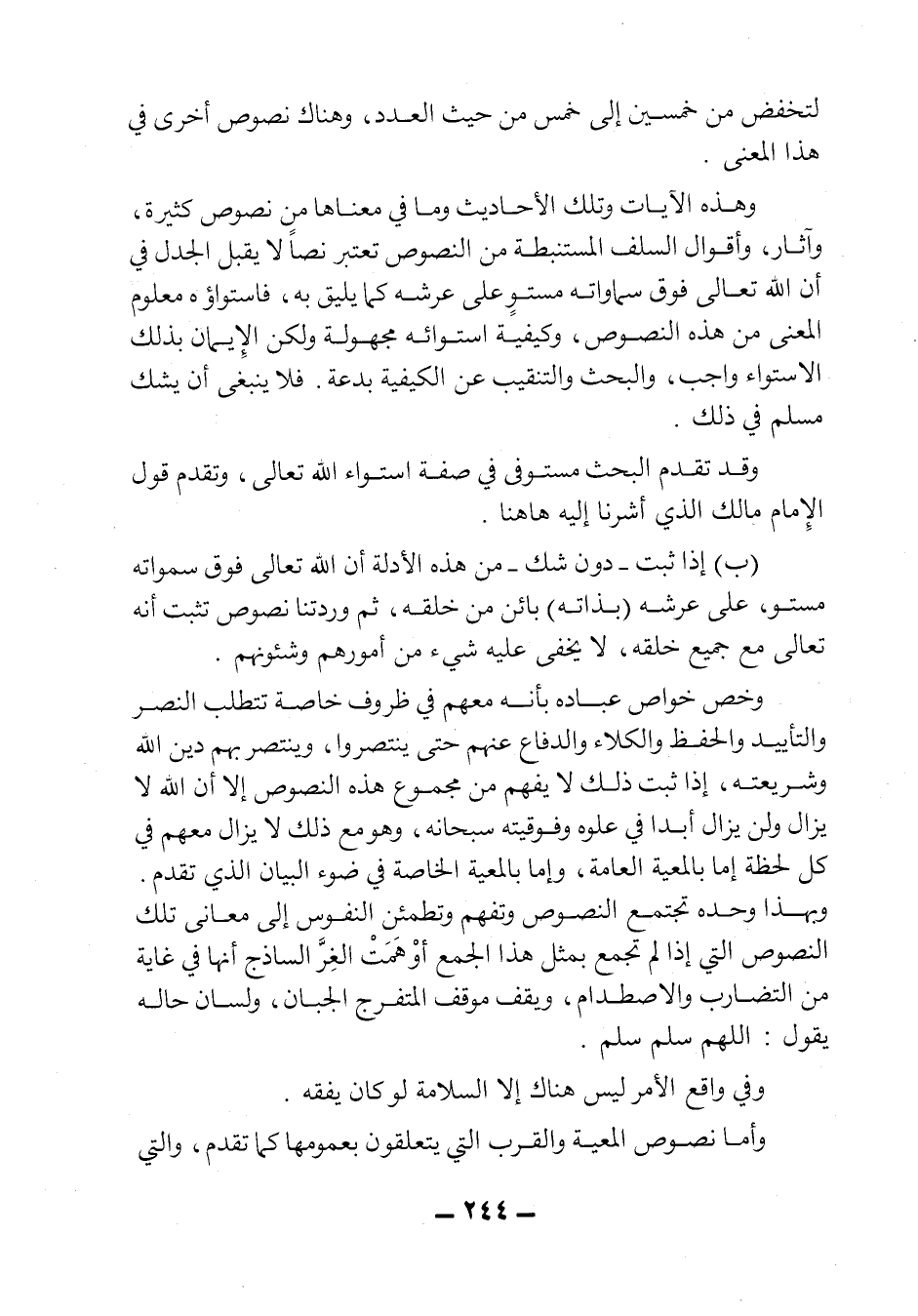 وخص خواص عباده بأنه معهم في ظروف خاصة تتطلب النصر والتأييد والحفظ والكلاء، والدفاع عنهم حتى ينتصروا، وينتصر بهم دين الله وشريعته، إذا ثبت ذلك لا يفهم من مجموع هذه النصوص إلا أن الله لا يزال ولم يزال أبداً في علوه وفوقيته سبحانه، وهو مع ذلك لا يزال معهم في كل لحظة إما بالمعية العامة، وإما بالمعية الخاصة في ضوء البيان الذي تقدم، وبهذا وحده تجتمع النصوص وتفهم وتطمئن النفوس إلى معاني تلك النصوص التي إذا لم تجمع بمثل هذا الجمع أوهمت الغِرَّ الساذج أنها في غاية من التضارب والاصطدام، ويقف موقف المتفرج الجبان، ولسان حاله يقول: اللهم سلم سلم.