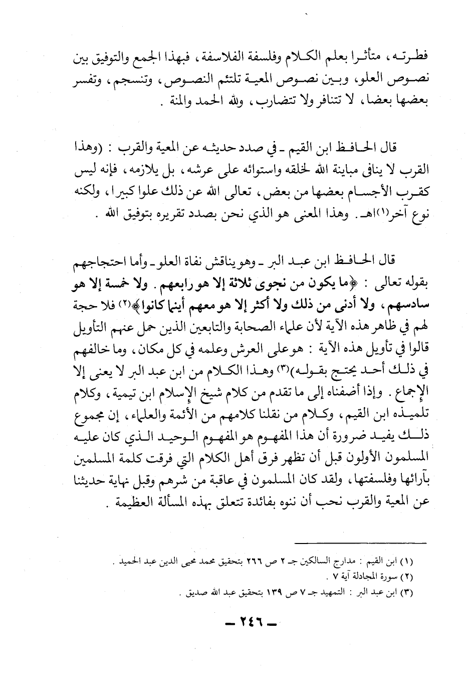 فطرته، متأثراً بعلم الكلام وفلسفة الفلاسفة، فبهذا الجمع والتوفيق بين نصوص العلو، وبين نصوص المعية تلتئم النصوص، وتنسجم، وتفسر بعضها بعضاً، لا تتنافر ولا تتضارب، ولله الحمد والمنة.