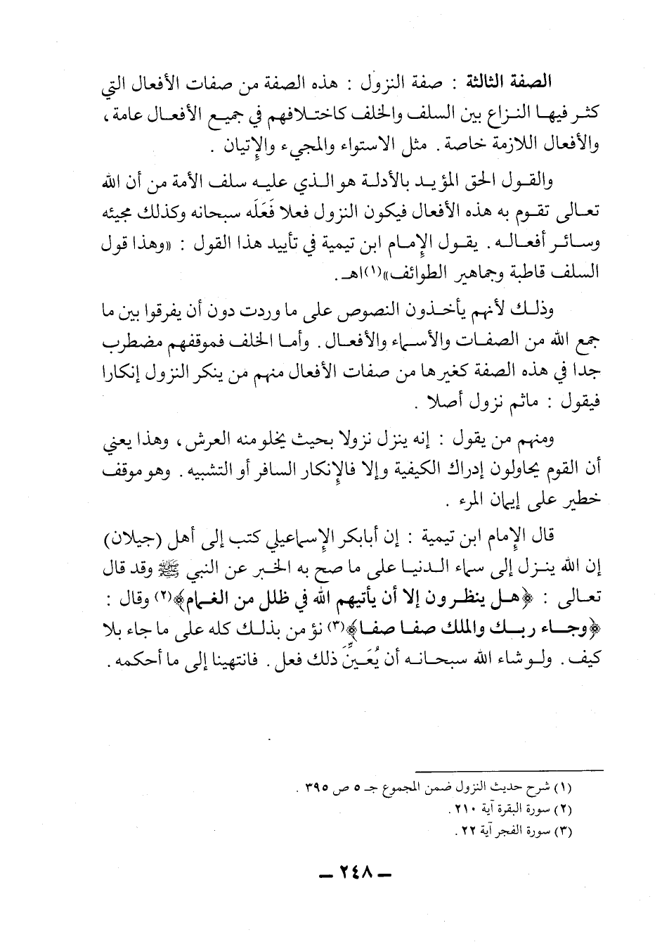 قال الإمام ابن تيمية: "إن أبا بكر الإسماعيلي كتب إلى أهل "جيلان" إن الله ينزل إلى سماء الدنيا على ما صح به الخبر عن النبي صلى الله عليه وسلم، وقد قال تعالى: {هَلْ يَنظُرُونَ إِلاَّ أَن يَأْتِيَهُمُ اللهُ فِي ظُلَلٍ مِّنَ الْغَمَامِ} 2، وقال: {وَجَاء رَبُّكَ وَالْمَلَكُ صَفًّا صَفًّا} 3، نؤمن بذلك كله على ما جاء بلا كيف، ولو شاء الله سبحانه أن يعين ذلك فعل. فانتهينا إلى ما أحكمه.