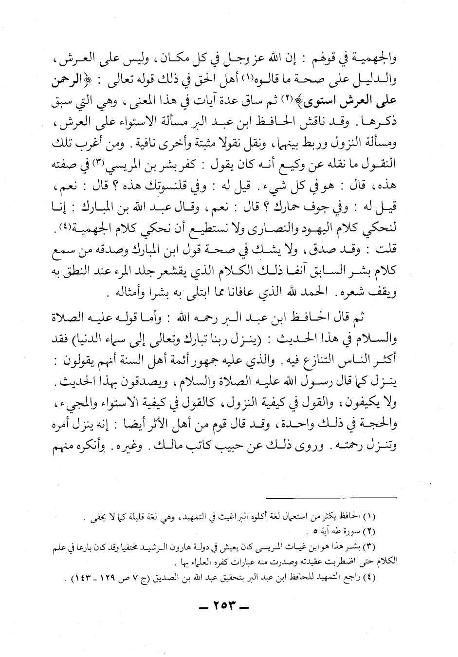 وقد ناقش الحافظ ابن عبد البر مسألة الاستواء على العرش، ومسألة النزول وربط بينهما، ونقل نقولاً مثبتة وأخرى نافية، ومن أغرب تلك النقول ما نقله عن وكيع أنه كان يقول: كفر بشر بن المريسي3 في صفته هذه، قال: هو في كل شيء، قيل له: وفي قلنسوتك هذه؟ قال: نعم، قيل له: وفي جوف حمارك؟ قال: نعم، وقال عبد الله بن المبارك: إنا لنحكي كلام اليهود والنصارى ولا نستطيع أن نحكي كلام الجهمية4.