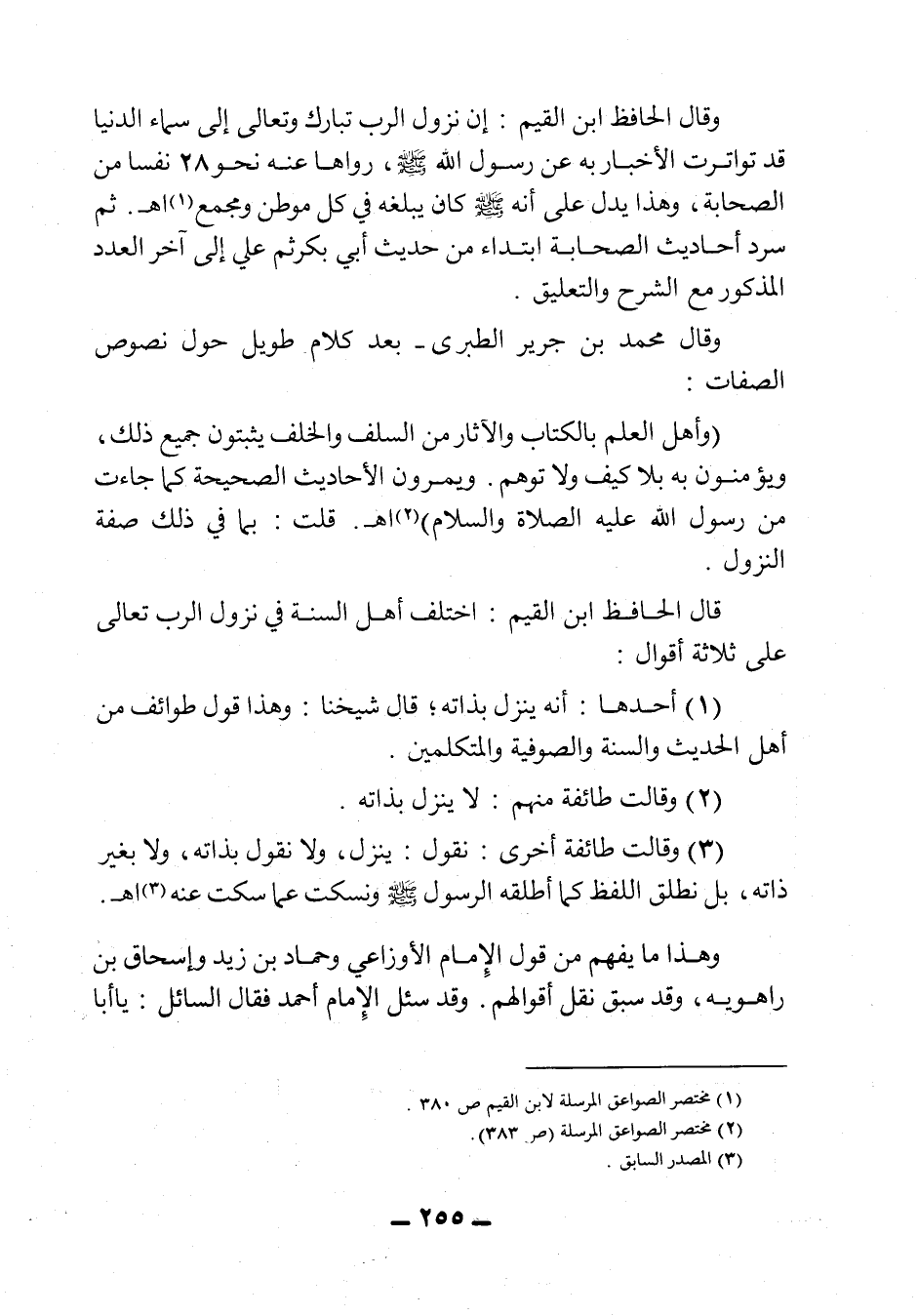 قال الحافظ ابن القيم: اختلف أهل السنة في نزول الرب تعالى على ثلاثة أقوال: