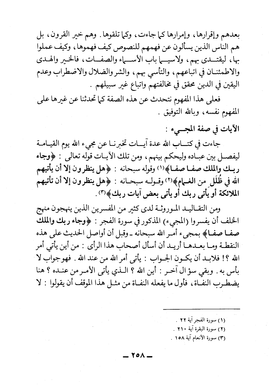 جاءت في كتاب الله عدة آيات تخبرنا عن مجيء الله يوم القيامة ليفصل بين عباده وليحكم بينهم، ومن تلك الآيات قوله تعالى: {وَجَاء رَبُّكَ وَالْمَلَكُ صَفًّا صَفًّا} 1، وقوله سبحانه: {هَلْ يَنظُرُونَ إِلاَّ أَن يَأْتِيَهُمُ اللهُ فِي ظُلَلٍ مِّنَ الْغَمَامِ} 2، وقوله سبحانه: {هَلْ يَنظُرُونَ إِلاَّ أَن تَأْتِيهُمُ الْمَلآئِكَةُ أَوْ يَأْتِيَ رَبُّكَ أَوْ يَأْتِيَ بَعْضُ آيَاتِ رَبِّكَ} 3.