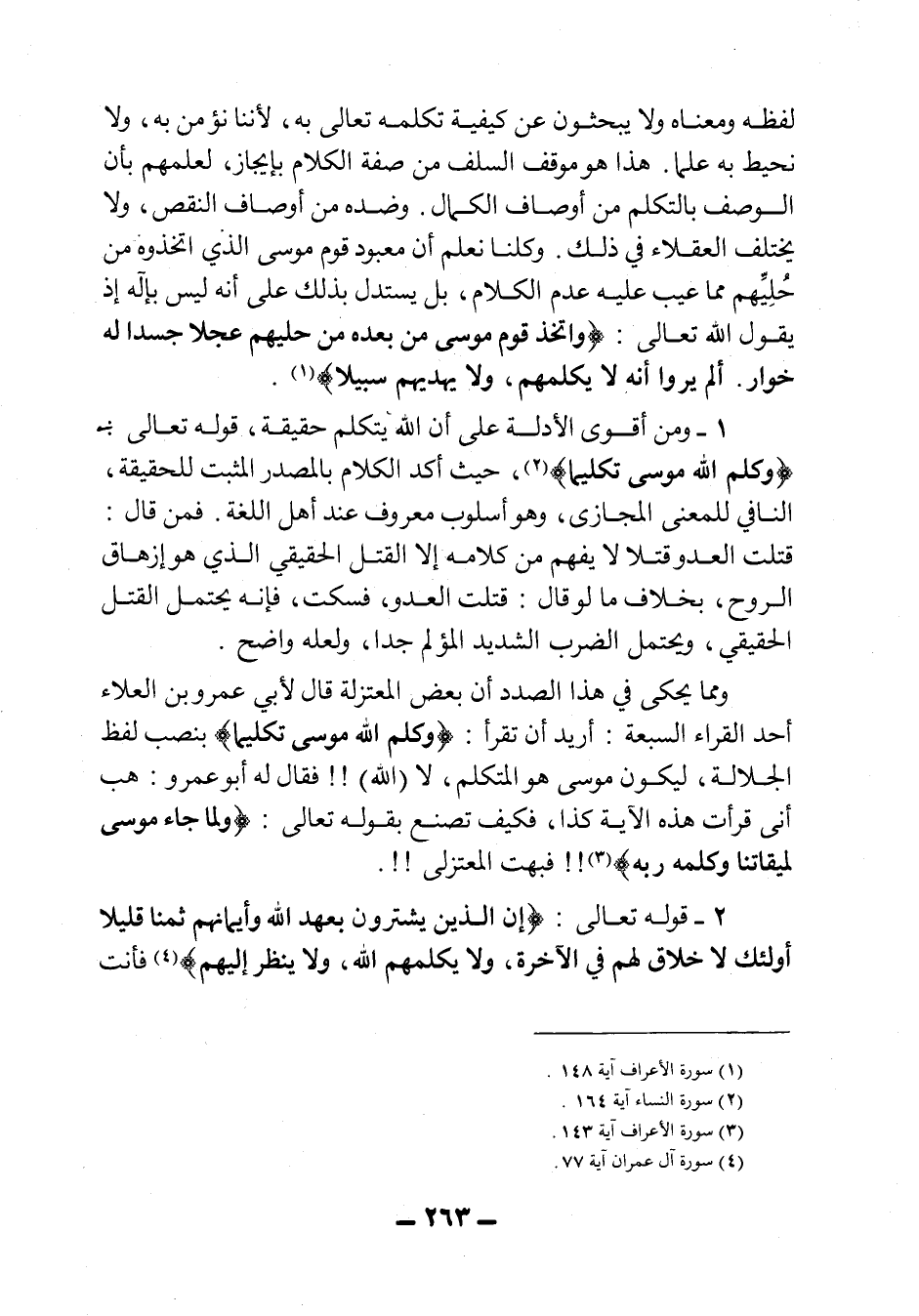 1- ومن أقوى الأدلة على أن الله يتكلم حقيقة، قوله تعالى: {وَكَلَّمَ اللهُ مُوسَى تَكْلِيمًا} 2، حيث أكد الكلام بالمصدر المثبت للحقيقة النافي للمعنى المجازي، وهو أسلوب معروف عند أهل اللغة، فمن قال: قتلت العدو قتلاً لا يفهم من كلامه إلا القتل الحقيقي الذي هو إزهاق الروح، بخلاف ما لو قال: قتلت العدو فسكت، فإنه يحتمل القتل الحقيقي، ويحتمل الضرب الشديد المؤلم جداً، ولعله واضح.