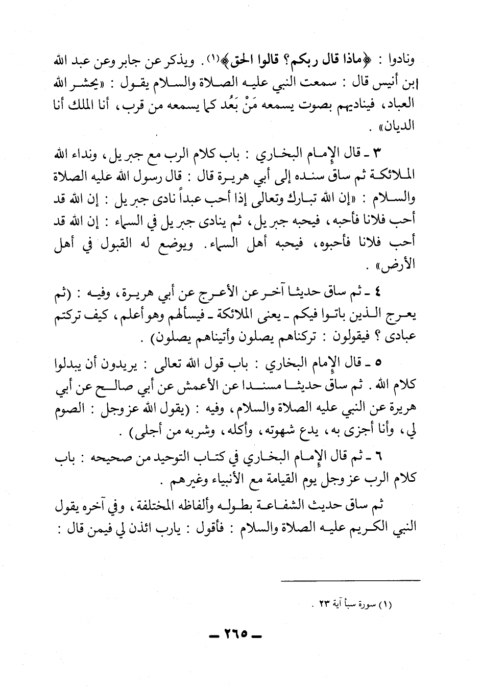 3- قال الإمام البخاري: باب كلام الرب مع جبريل، ونداء الله الملائكة، ثم ساق سنده إلى أبي هريرة قال: قال رسول الله عليه الصلاة والسلام: "إن الله تبارك وتعالى إذا أحب عبداً نادى جبريل: إن الله قد أحب فلاناً فأحبه، فيحبه جبريل، ثم ينادي جبريل في السماء: إن الله قد أحب فلاناً فأحبوه، فيحبه أهل السماء، ويوضع له القبول في أهل الأرض".