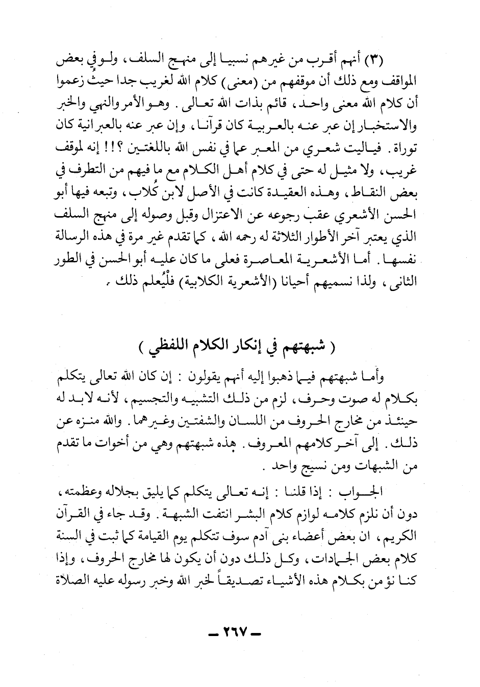 إنه لموقف غريب ولا مثيل له حتى في كلام أهل الكلام مع ما فيهم من التطرف في بعض النقاط، وهذه العقيدة كانت في الأصل لابن كُلاب، وتبعه فيها أبو الحسن الأشعري عقب رجوعه عن الاعتزال وقبل وصوله إلى منهج السلف الذي يعتبر آخر الأطوار الثلاثة له رحمه الله، كما تقدم غير مرة في هذه الرسالة نفسها، أما الأشعرية المعاصرة فعلى ما كان عليه أبو الحسن في الطور الثاني، ولذا نسميهم أحياناً "الأشعرية الكلابية" فليُعلم ذلك.
