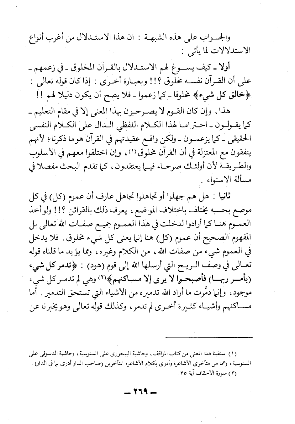 ثانياً: هل هم جهلوا أو تجاهلوا تجاهل عارف أن عموم "كل" في كل موضع بحسبه يختلف باختلاف المواضع، يعرف ذلك بالقرائن؟!! ولو أخذ العموم هنا كما أرادوا لدخلت في هذا العموم جميع صفات الله تعالى، بل المفهوم الصحيح أن عموم "كل" هنا إنما يعني كل شيء مخلوق. فلا يدخل في العموم شيء من صفات الله، من الكلام وغيره، ومما يؤيد ما قلناه قوله تعالى في وصف الريح التي أرسلها الله إلى قوم "هود" {تُدَمِّرُ كُلَّ شَيْءٍ بِأَمْرِ رَبِّهَا فَأَصْبَحُوا لاَ يُرَى إِلاَّ مَسَاكِنُهُمْ} 2، وهي لم تدمر كل شيء موجود، وإنما دمّرت ما أراد الله تدميره من الأشياء التي تستحق التدمير. أما مساكنهم وأشياء كثيرة أخرى لم تدمر، وكذلك قوله تعالى وهو يخبرنا عن
