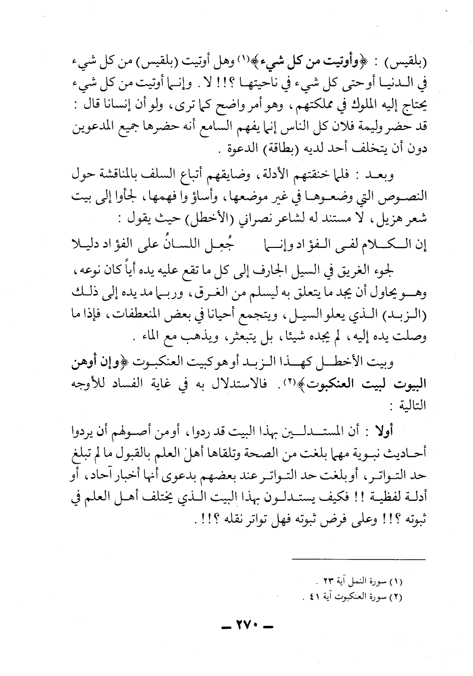 وبيت الأخطل كهذا الزبد أو هو كبيت العنكبوت {وَإِنَّ أَوْهَنَ الْبُيُوتِ لَبَيْتُ الْعَنكَبُوتِ} 2 فالاستدلال به في غاية الفساد للأوجه التالية: