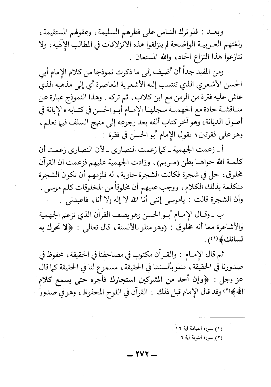 ب- وقال الإمام أبو الحسن وهو يصف القرآن الذي تزعم الجهمية والأشاعرة معاً أنه مخلوق: "وهو متلو بالألسنة، قال تعالى: {لاَ تُحَرِّكْ بِهِ لِسَانَكَ} 1".