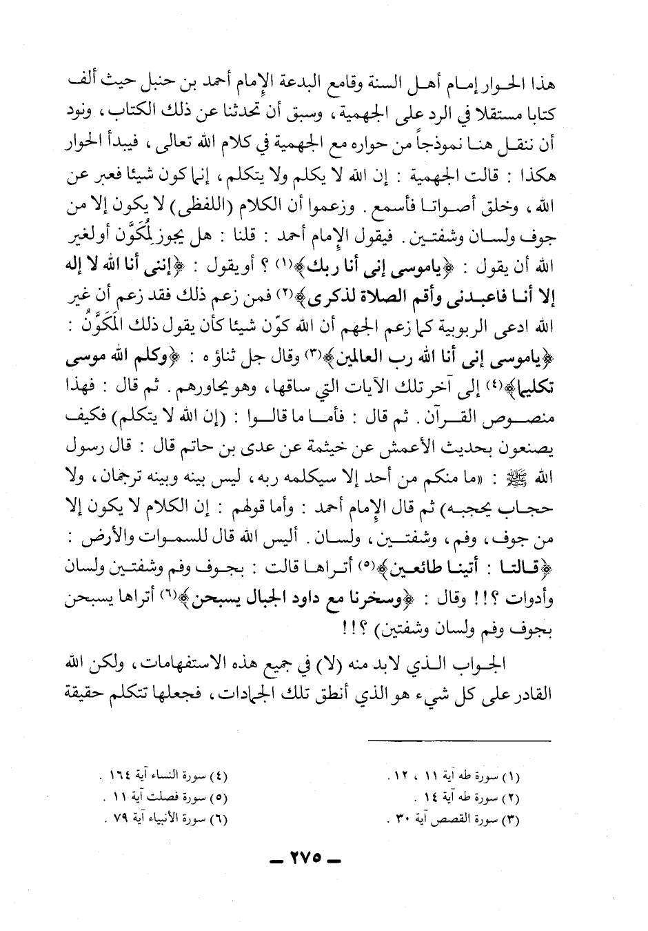 ثم قال الإمام أحمد أما قولهم: إن الكلام لا يكون إلا من جوف، وفم وشفتين، ولسان، أليس الله قال للسموات والأرض: {اِئْتِيَا طَوْعاً أَوْ كَرْهاً قَالَتَا أَتَيْنَا طَائِعِينَ} 5، أتراها قالت: بجوف وفم وشفتين ولسان وأدوات؟!! وقال: {وَسَخَّرْنَا مَعَ دَاوُودَ الْجِبَالَ يُسَبِّحْنَ} 6، أتراها يسبحن بجوف وفم ولسان وشفتين"؟!!
