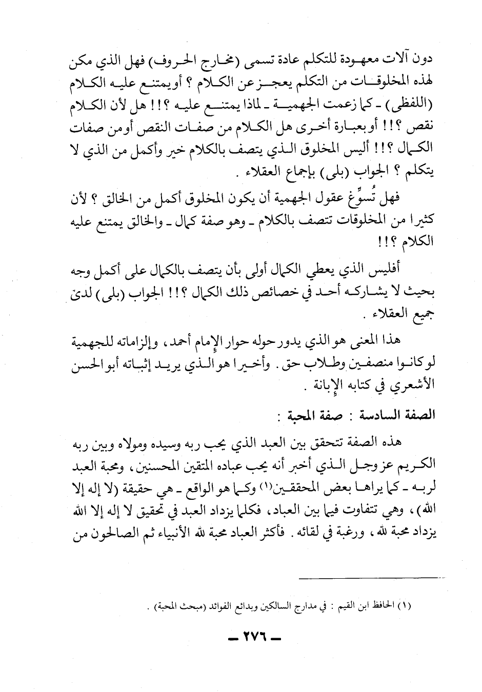 دون آلات معهودة للتكلم عادة تسمى "مخارج الحروف"، فهل الذي مكن لهذه المخلوقات من التكلم يعجز عن الكلام؟ أو يمتنع عليه الكلام "اللفظي" - كما زعمت الجهمية - لماذا يمتنع عليه؟!! هل لأن الكلام نقص؟!! أو بعبارة أخرى: هل الكلام من صفات النقص أو من صفات الكمال؟!! أليس المخلوق الذي يتصف بالكلام خير وأجمل من الذي لا يتكلم؟ الجواب "بلى" بإجماع العقلاء.