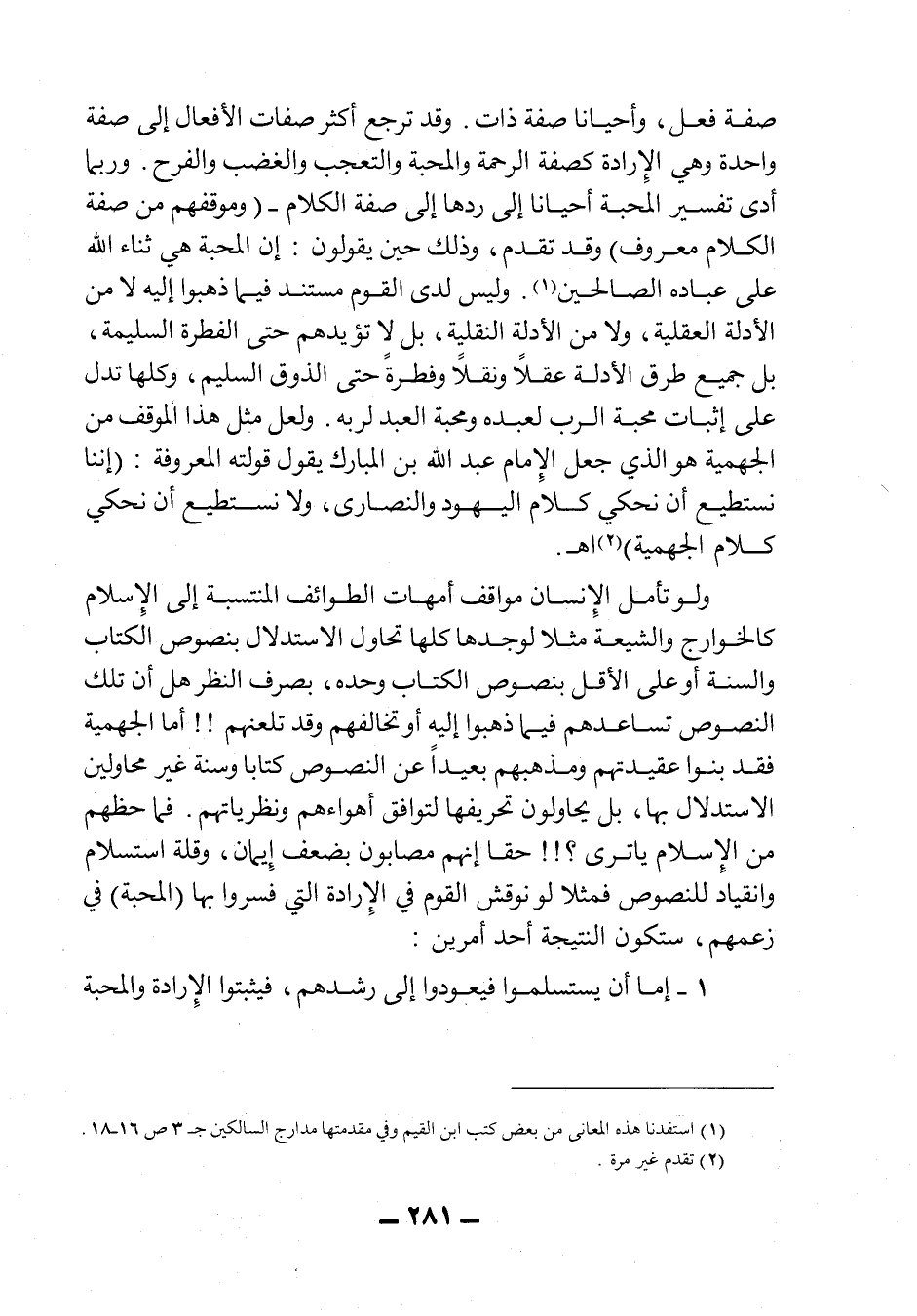 صفة فعل، وأحياناً صفة ذات. وقد ترجع أكثر صفات الأفعال إلى صفة واحدة وهي الإرادة كصفة الرحمة والمحبة والتعجب والغضب والفرح. وربما أدى تفسير المحبة أحياناً إلى ردها إلى صفة الكلام -"وموقفهم من صفة الكلام معروف" وقد تقدم، وذلك حين يقولون: إن المحبة هي ثناء الله على عباده الصالحين1.