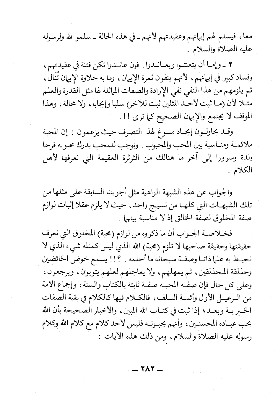 فخلاصة الجواب أن ما ذكروه من لوازم "محبة" المخلوق التي نعرف حقيقتها وحقيقة صاحبها لا تلزم "محبة" الله الذي ليس كمثله شيء الذي لا نحيط به علماً ذاتاً وصفة سبحانه ما أحلمه؟!! يسمع خوض الخائضين وحذلقة المتحذلقين، ثم يمهلهم، ولا يعاجلهم لعلهم يتوبون، ويرجعون، وعلى كل حال فإن صفة المحبة صفة ثابتة بالكتاب والسنة، وإجماع الأمة من الرعيل الأول وأئمة السلف، فالكلام فيها كالكلام في بقية الصفات الخبرية وبعد إذا ثبت في كتاب الله المبين، والأخبار الصحيحة بأن الله يحب عباده المحسنين، وأنهم يحبونه فليس لأحد كلام مع كلام الله وكلام رسوله عليه الصلاة والسلام، ومن ذلك هذه الآيات: