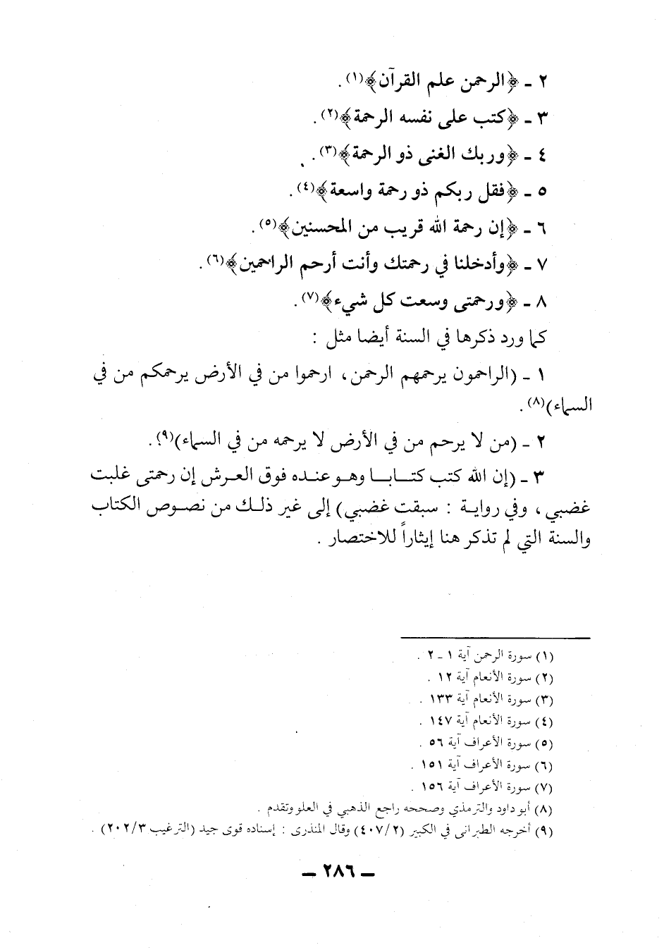 3- "إن الله كتب كتاباً وهو عنده فوق العرش، إن رحمتي غلبت غضبي "، وفي رواية "سبقت غضبي" إلى غير ذلك من نصوص الكتاب والسنة التي لم تذكر هنا إيثاراً للاختصار.