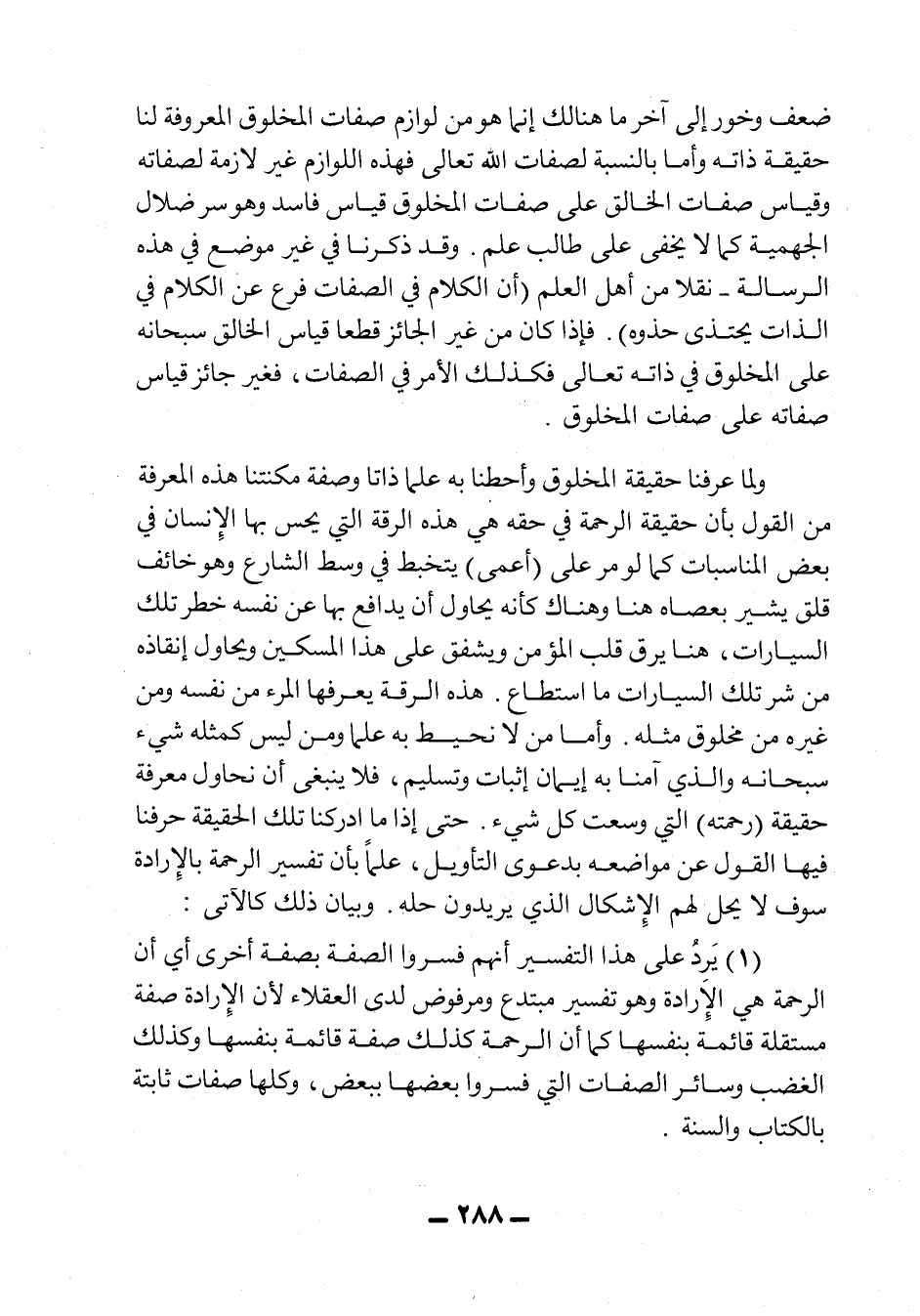 ولما عرفنا حقيقة المخلوق وأحطنا به علماً ذاتاً وصفة مكنتنا هذه المعرفة من القول بأن حقيقة الرحمة في حقه هي هذه الرقة التي يحس بها الإنسان في بعض المناسبات، كما لو مر على "أعمى" يتخبط في وسط الشارع، وهو خائف قلق يشير بعصاه هنا وهناك، كأنه يحاول أن يدافع بها عن نفسه خطر تلك السيارات، هنا يرق قلب المؤمن ويشفق على هذا المسكين ويحاول إنقاذه من شر تلك السيارات ما استطاع. هذه الرقة يعرفها المرء من نفسه، ومن غيره من مخلوق مثله، وأما من لا نحيط به علماً ومن ليس كمثله شيء سبحانه والذي آمنا به إيمان إثبات وتسليم، فلا ينبغي أن نحاول معرفة حقيقة "رحمته" التي وسعت كل شيء. حتى إذا ما أدركنا تلك الحقيقة حرفنا فيها القول عن مواضعه بدعوى التأويل، علماً بأن تفسير الرحمة بالإرادة سوف لا يحل لهم الإشكال الذي يريدون حله. وبيان ذلك كالآتي: