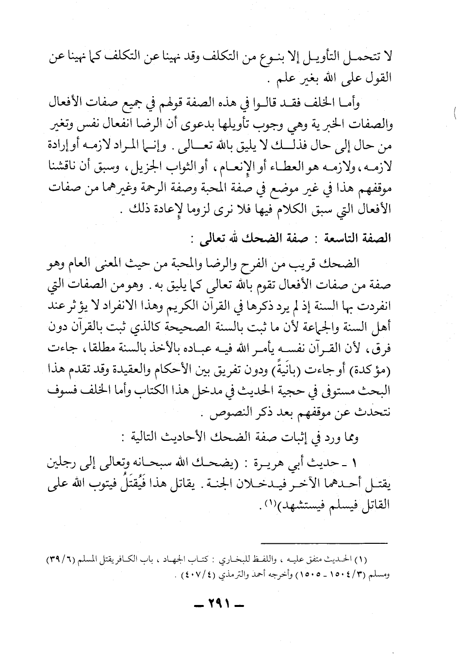 الضحك قريب من الفرح والرضا والمحبة، من حيث المعنى العام، وهو صفة من صفات الأفعال تقوم بالله تعالى كما يليق به، وهو من الصفات التي انفردت بها السنة إذ لم يرد ذكرها في القرآن الكريم، وهذا الانفراد لا يؤثر عند أهل السنة والجماعة، لأن ما ثبت بالسنة الصحيحة كالذي ثبت بالقرآن دون فرق، لأن القرآن نفسه يأمر الله فيه عباده بالأخذ بالسنة مطلقاً، جاءت "مؤكدة" أو جاءت "بانَيةً" ودون تفريق بين الأحكام والعقيدة، وقد تقدم هذا البحث مستوفى في حجية الحديث في مدخل هذا الكتاب، وأما الخلف فسوف نتحدث عن موقفهم بعد ذكر النصوص.