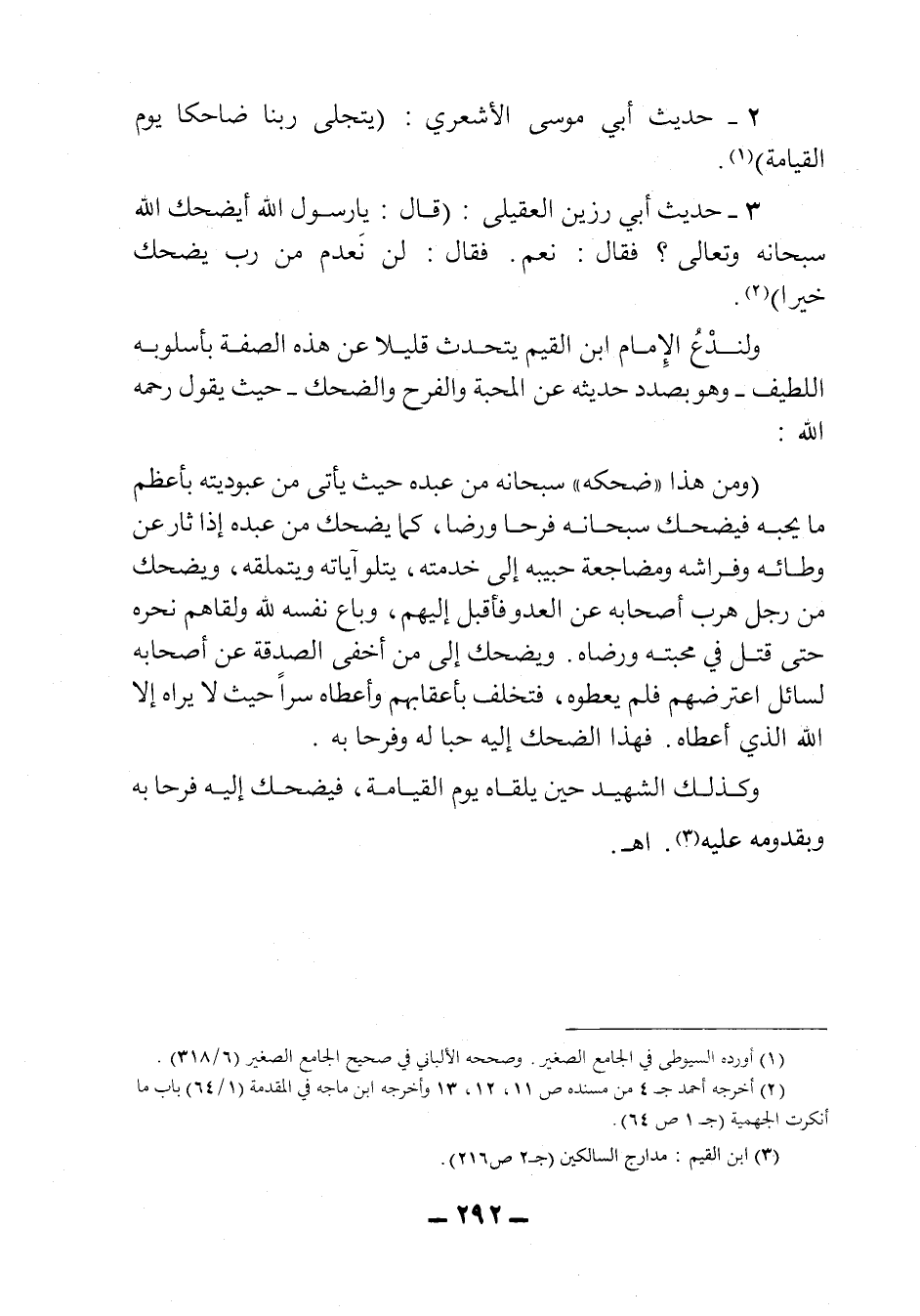 "ومن هذا "ضحكه" سبحانه من عبده حيث يأتي من عبوديته بأعظم ما يحبه فيضحك سبحانه فرحاً ورضا، كما يضحك من عبده إذا ثار عن وطائه وفراشه ومضاجعة حبيبه إلى خدمته، يتلو آياته ويتملقه، ويضحك من رجل هرب أصحابه عن العدو فأقبل إليهم، وباع نفسه لله ولقاهم نحره حتى قتل في محبته ورضاه. ويضحك إلى من أخفى الصدقة عن أصحابه لسائل اعترضهم فلم يعطوه، فتخلف بأعقابهم وأعطاه سراً حيث لا يراه إلا الله الذي أعطاه، فهذا الضحك إليه حباً له وفرحاً به.