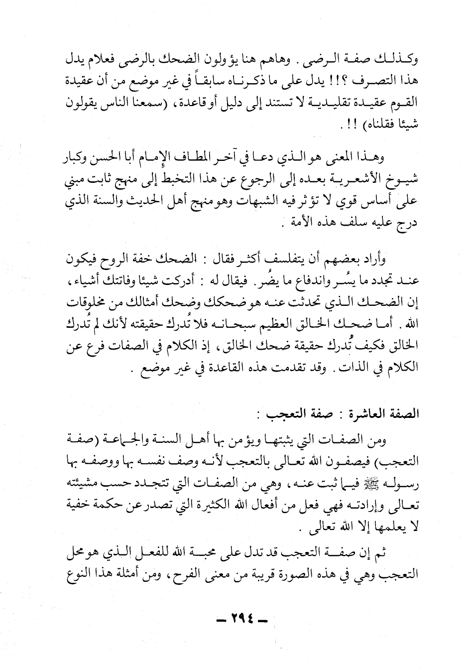 ومن الصفات التي يثبتها ويؤمن بها أهل السنة والجماعة "صفة التعجب" فيصفون الله تعالى بالتعجب، لأنه وصف نفسه بها ووصفه بها رسوله صلى الله عليه وسلم فيما ثبت عنه، وهي من الصفات التي تتجدد حسب مشيئته تعالى وإرادته، فهي فعل من أفعال الله الكثيرة التي تصدر عن حكمة خفية لا يعلمها إلى الله تعالى.