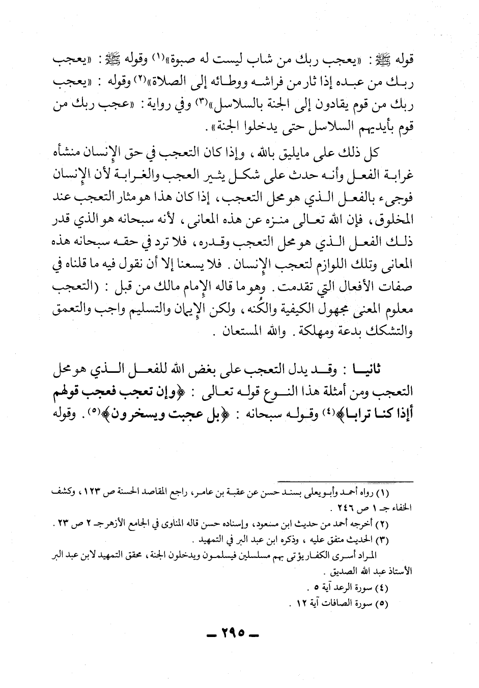 قوله صلى الله عليه وسلم: "يعجب ربك من شاب ليست له صبوة" 1، وقوله صلى الله عليه وسلم: "يعجب ربك من عبده إذا ثار من فراشه ووطائه إلى الصلاة "2، وقوله: "يعجب ربك من قوم يقادون إلى الجنة بالسلاسل" 3، وفي رواية: "عجب ربك من قوم بأيدهم السلاسل حتى يدخلوا الجنة".