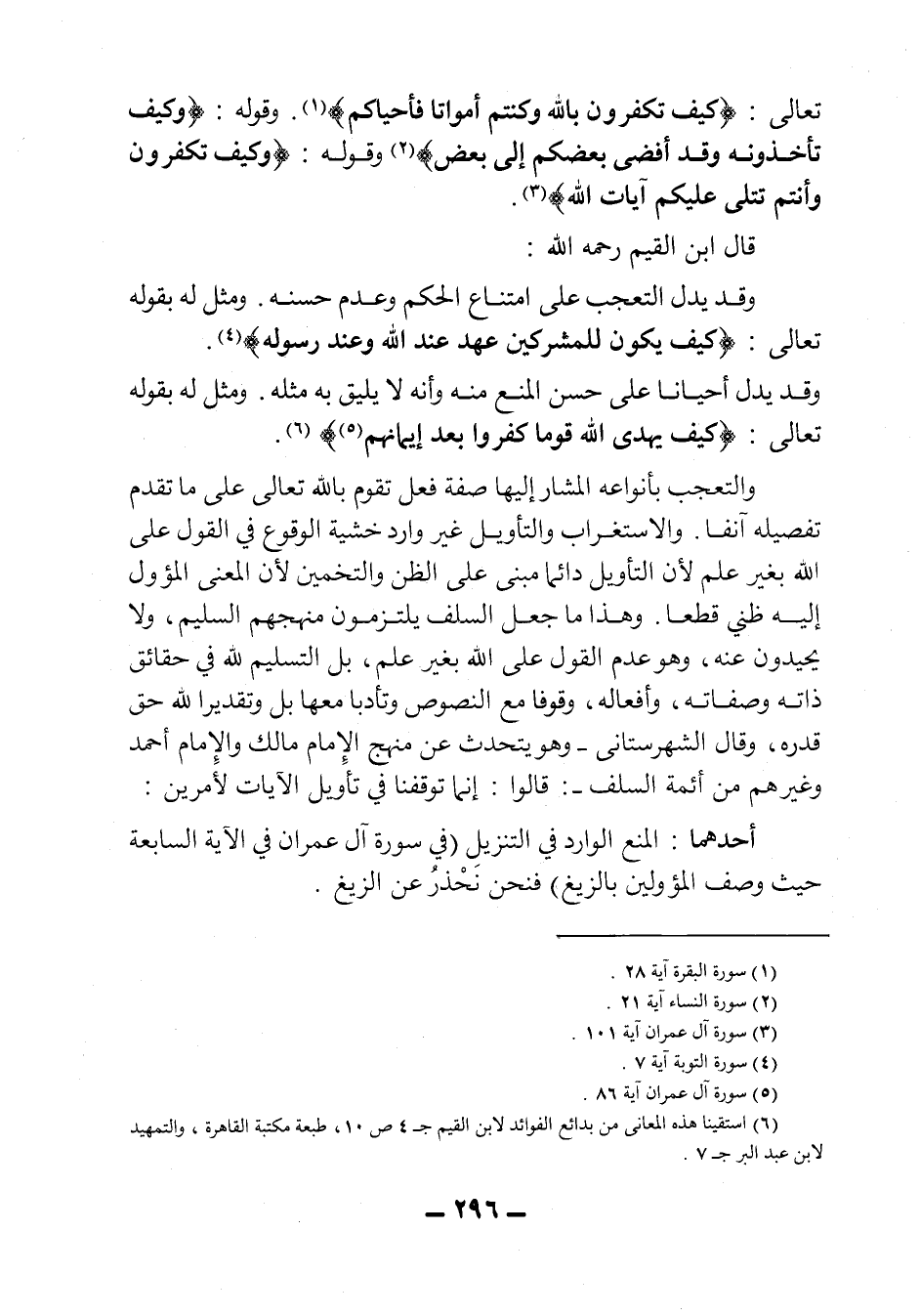والتعجب بأنواعه المشار إليها صفة فعل تقوم بالله تعالى على ما تقدم تفصيله آنفاً. والاستغراب والتأويل غير وارد خشية الوقوع في القول على الله بغير علم لأن التأويل دائماً مبني على الظن والتخمين، لأن المعنى المؤول إليه ظني قطعاً. وهذا ما جعل السلف يلتزمون منهجهم السليم، ولا يحيدون عنه، وهو عدم القول على الله بغير علم، بل التسليم لله في حقائق ذاته وصفاته، وأفعاله، وقوفاً مع النصوص وتأدباً معها بل وتقديراً لله حق قدره.