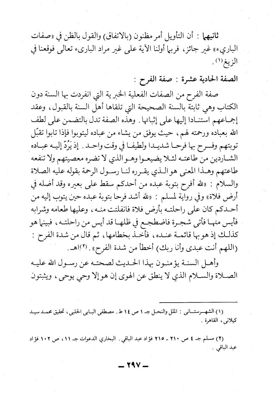 صفة الفرح من الصفات الفعلية الخبرية التي انفردت بها السنة دون الكتاب، وهي ثابتة بالسنة الصحيحة التي تلقاها أهل السنة بالقبول، وعقد إجماعهم استناداً إليها على إثباتها، وهذه الصفة تدل بالتضمن على لطف الله بعباده ورحمته لهم، حيث يوفق من يشاء من عباده ليتوبوا فإذا تابوا تقبّل توبتهم وفرح بها فرحاً شديداً ولطيفاً في وقت واحد، إذ يَرُدّ إليه عباده الشاردين من طاعته لئلا يضيعوا، وهو الذي لا تضره معصيتهم ولا تنفعه طاعتهم.