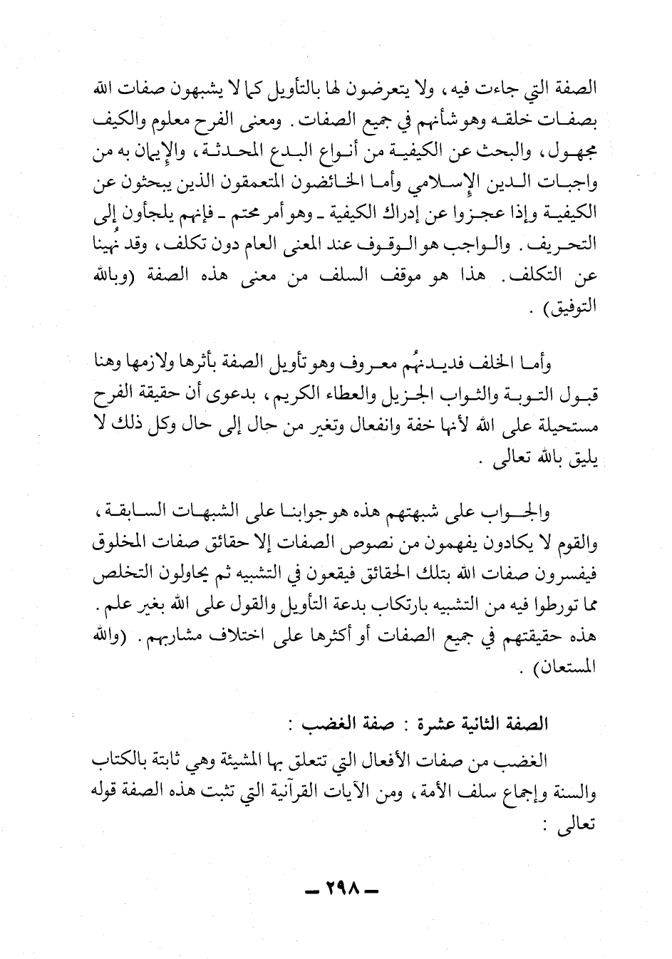 الصفة التي جاءت فيه، ولا يتعرضون لها بالتأويل كما لا يشبهون صفات الله بصفات خلقه، وهو شأنهم في جميع الصفات. ومعنى الفرح معلوم والكيف مجهول، والبحث عن الكيفية من أنواع البدع المحدثة، والإيمان به من واجبات الدين الإسلامي وأما الخائضون المتعمقون الذي يبحثون عن الكيفية، وإذا عجزوا عن إدراك الكيفية - وهو أمر محتم- فإنهم يلجأون إلى التحريف. والواجب هو الوقوف عند المعنى العام دون تكلف، وقد نُهينا عن التكلف، هذا هو موقف السلف من معنى هذه الصفة وبالله التوفيق.