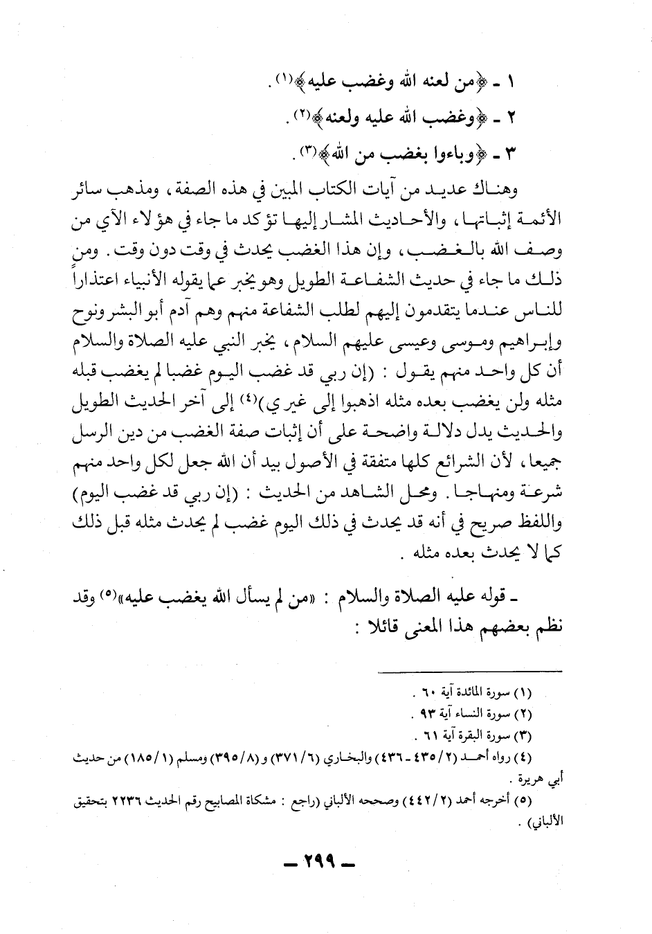 وهناك عديد من آيات الكتاب المبين في هذه الصفة، ومذهب سائر الأئمة إثباتها، والأحاديث المشار إليها تؤكد ما جاء في هؤلاء الآي من وصف الله بالغضب، وإن هذا الغضب يحدث في وقت دون وقت، ومن ذلك ما جاء في حديث الشفاعة الطويل وهو يخبر عما يقوله الأنبياء اعتذاراً للناس عندما يتقدمون إليهم لطلب الشفاعة منهم، وهم: آدم أوب البشر، ونوح، وإبراهيم وموسى وعيسى عليهم السلام، يخبر النبي عليه الصلاة والسلام أن كل واحد منهم يقول: " إن ربي غضب اليوم غضباً لم يغضب قبله مثله، ولن يغضب بعده مثله، اذهبوا إلى غيري" 4 إلى آخر الحديث الطويل.