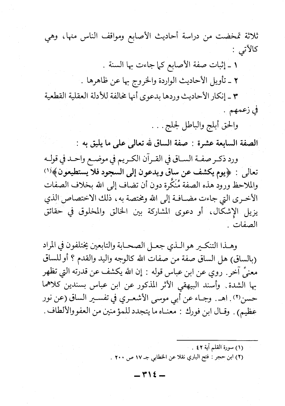 وهذا التنكير هو الذي جعل الصحابة والتابعين يختلفون في المراد (بالساق) ، هل الساق صفة من صفات الله كالوجه واليد والقدم؟ أو للساق معنىً آخر. روي عن ابن عباس قوله: إن الله يكشف عن قدرته التي تظهر بها الشدة. وأسند البيهقي الأثر المذكور عن ابن عباس بسندين كلاهما حسن2 اهـ.