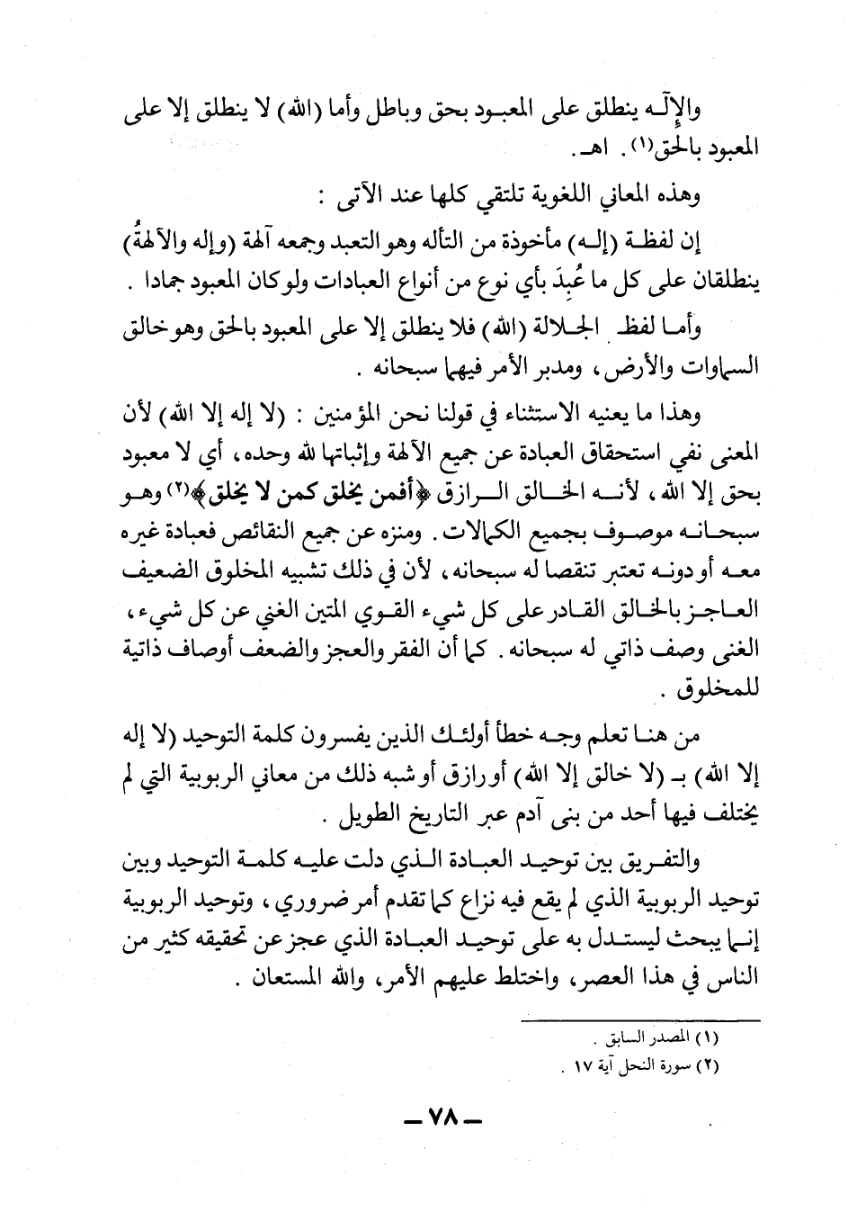 وهذا ما يعنيه الاستثناء في قولنا نحن المؤمنين: "لا إله إلا الله" لأن المعنى نفي استحقاق العبادة عن جميع الآلهة وإثباتها لله وحده، أي لا معبود بحق إلا الله، لأنه الخالق الرازق {أَفَمَن يَخْلُقُ كَمَن لاَّ يَخْلُقُ} 2، وهو سبحانه موصوف بجميع الكمالات، ومنزه عن جميع النقائص فعيادة غيره معه أو دونه تعتبر تنقصاً له سبحانه، لأن في ذلك تشبيه المخلوق الضعيف العاجز بالخالق القادر على كل شيء القوي المتين الغني عن كل شيء، الغني وصف ذاتي له سبحانه. كما أن الفقر والعجز والضعف أوصاف ذاتية للمخلوق.