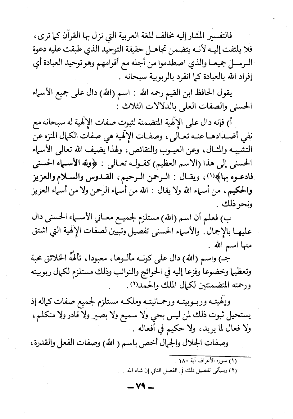 ب- فعلم أن اسم "الله" مستلزم لجميع معاني الأسماء الحسنى دال عليها بالإجمال. والأسماء الحسنى تفصيل وتبيين لصفات الإلهية التي اشتق منها اسم الله.