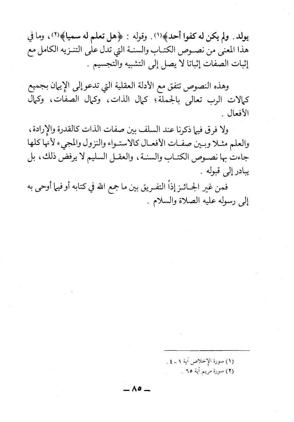 يُولَدْ وَلَمْ يَكُن لَّهُ كُفُوًا أَحَدٌ} 1، وقوله: {هَلْ تَعْلَمُ لَهُ سَمِيًّا} 2، وما في هذا المعنى من نصوص الكتاب والسنة التي تدل على التنزيه الكامل مع إثبات الصفات إثباتاً لا يصل إلى التشبيه والتجسيم.