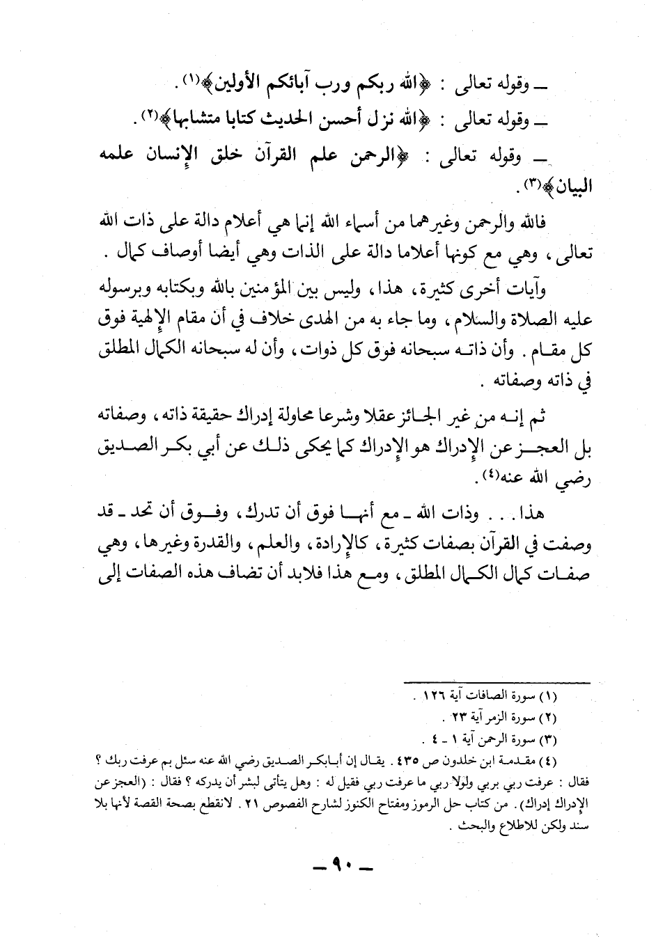 4 مقدمة ابن خلدون ص: 435. يقال إن أبا بكر الصديق رضي الله عنه سئل بم عرفت ربك؟ فقال: عرفت ربي بربي، ولولا ربي ما عرفت ربي، فقيل له: وهل يتأتى لبشر أن يدركه؟ فقال: "العجز عن الإدراك إدراك". من كتاب حل الرموز ومفتاح الكنوز لشارح الفصوص 21، لانقطع بصحة القصة لأنها بلا سند، ولكن للاطلاع والبحث.