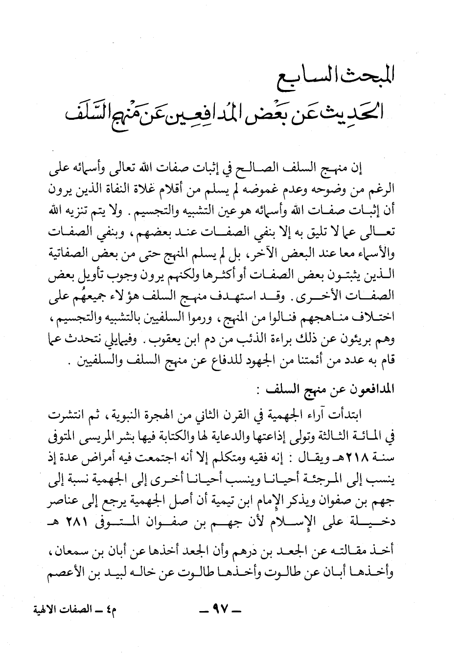 إن منهج السلف الصالح في إثبات صفات الله تعالى وأسمائه على الرغم من وضوحه وعدم غموضه لم يسلم من أقلام غلاة النفاة الذين يرون أن إثبات صفات الله وأسمائه هو عين التشبيه والتجسيم. ولا يتم تنزيه الله تعالى عما لا تليق به إلا بنفي الصفات عند بعضهم، وبنفي الصفات والأسماء معاً عند البعض الآخر، بل لم يسلم المنهج حتى من بعض الصفاتية الذين يثبتون بعض الصفات أو أكثرها ولكنهم يرون وجوب تأويل بعض الصفات الأخرى، وقد استهدف منهج السلف هؤلاء جميعُهم على اختلاف مناهجهم فنالوا من المنهج، ورموا السلفيين بالتشبيه والتجسيم، وهم بريئون عن ذلك براءة الذئب من دم ابن يعقوب. وفيما يلي نتحدث عما قام به عدد من أئمتنا من الجهود للدفاع عن منهج السلف والسلفيين.