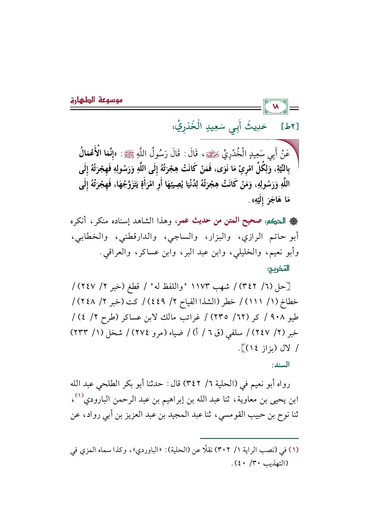 [الحكم]: صحيح المتن من حديث عمر، وهذا الشاهد إسناده منكر، أنكره أبو حاتم الرازي، والبزار، والساجي، والدارقطني، والخطابي، وأبو نعيم، والخليلي، وابن عبد البر، وابن عساكر، والعراقي.