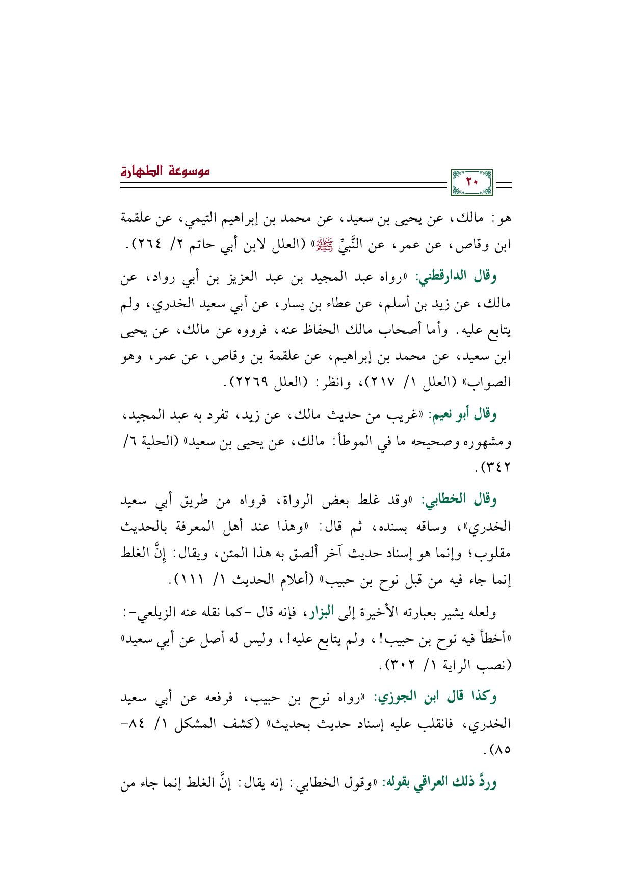 وقال الدارقطني: «رواه عبد المجيد بن عبد العزيز بن أبي رواد، عن مالك، عن زيد بن أسلم، عن عطاء بن يسار، عن أبي سعيد الخدري، ولم يتابع عليه. وأما أصحاب مالك الحفاظ عنه، فرووه عن مالك، عن يحيى بن سعيد، عن محمد بن إبراهيم، عن علقمة بن وقاص، عن عمر، وهو الصواب» (العلل ١/ ٢١٧)، وانظر: (العلل ٢٢٦٩).