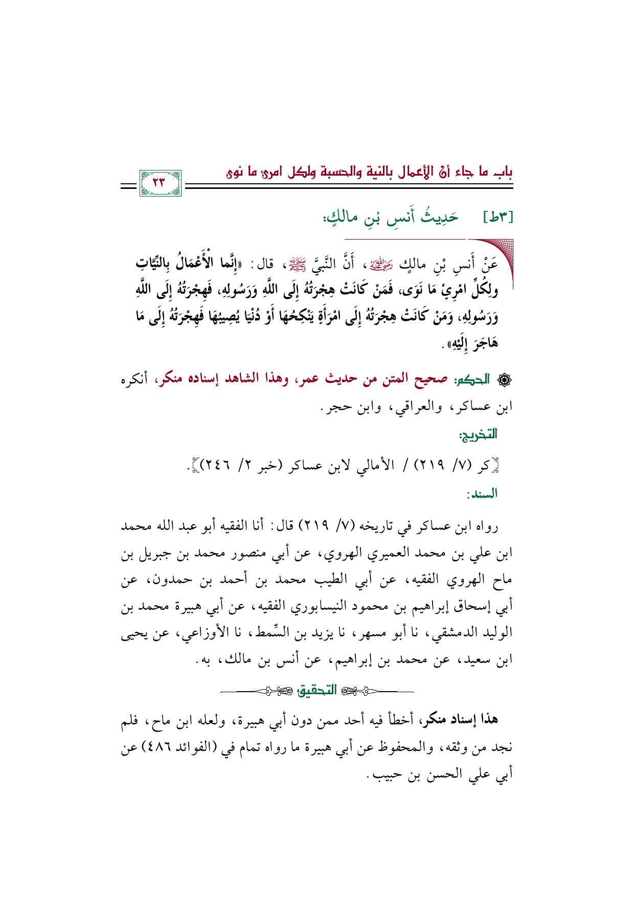 رواه ابن عساكر في تاريخه (٧/ ٢١٩) قال: أنا الفقيه أبو عبد الله محمد بن علي بن محمد العميري الهروي، عن أبي منصور محمد بن جبريل بن ماح الهروي الفقيه، عن أبي الطيب محمد بن أحمد بن حمدون، عن أبي إسحاق إبراهيم بن محمود النيسابوري الفقيه، عن أبي هبيرة محمد بن الوليد الدمشقي، نا أبو مسهر، نا يزيد بن السِّمط، نا الأوزاعي، عن يحيى بن سعيد، عن محمد بن إبراهيم، عن أنس بن مالك، به.