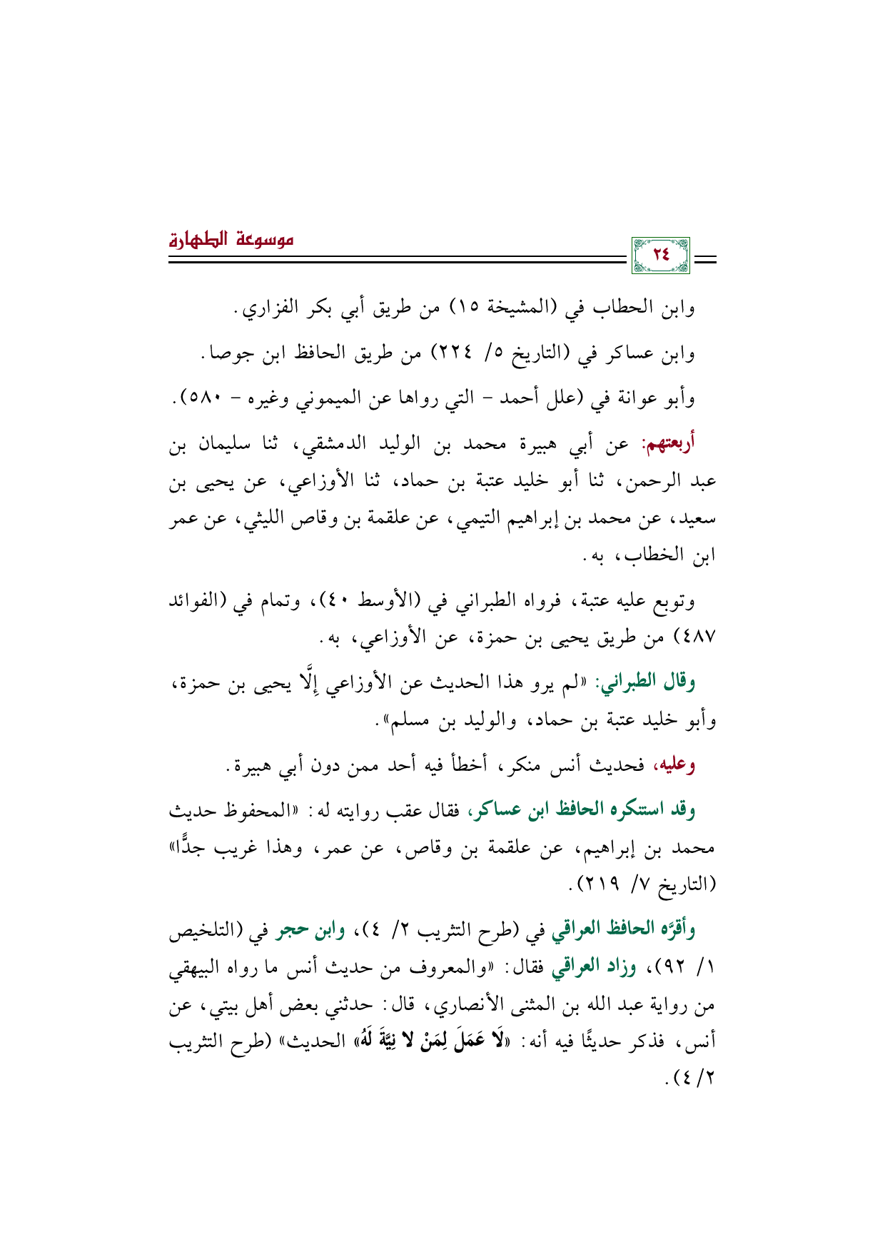وأقرَّه الحافظ العراقي في (طرح التثريب ٢/ ٤)، وابن حجر في (التلخيص ١/ ٩٢)، وزاد العراقي فقال: «والمعروف من حديث أنس ما رواه البيهقي من رواية عبدالله بن المثنى الأنصاري، قال: حدثني بعض أهل بيتي، عن أنس، فذكر حديثًا فيه أنه: «لَا عَمَلَ لِمَنْ لا نِيَّةَ لَهُ» الحديث» (طرح التثريب ٢/ ٤).