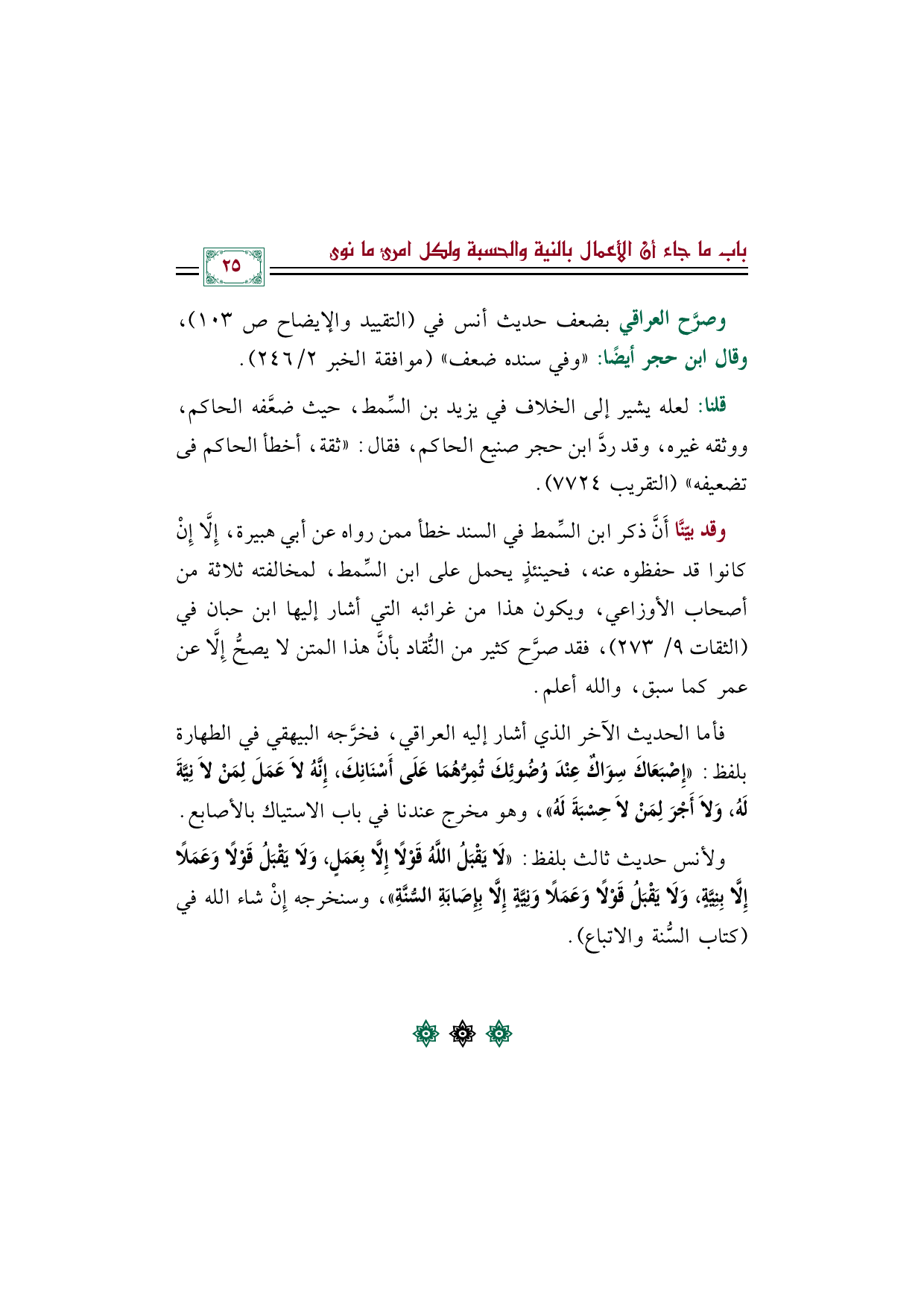 ولأنس حديث ثالث بلفظ: «لَا يَقْبَلُ اللَّهُ قَوْلًا إِلَّا بِعَمَلٍ، وَلَا يَقْبَلُ قَوْلًا وَعَمَلًا إِلَّا بِنِيَّةٍ، وَلَا يَقْبَلُ قَوْلًا وَعَمَلًا وَنِيَّةٍ إِلَّا بِإِصَابَةِ السُّنَّةِ»، وسنخرجه إِنْ شاء الله في «كتاب السُّنة والاتباع».