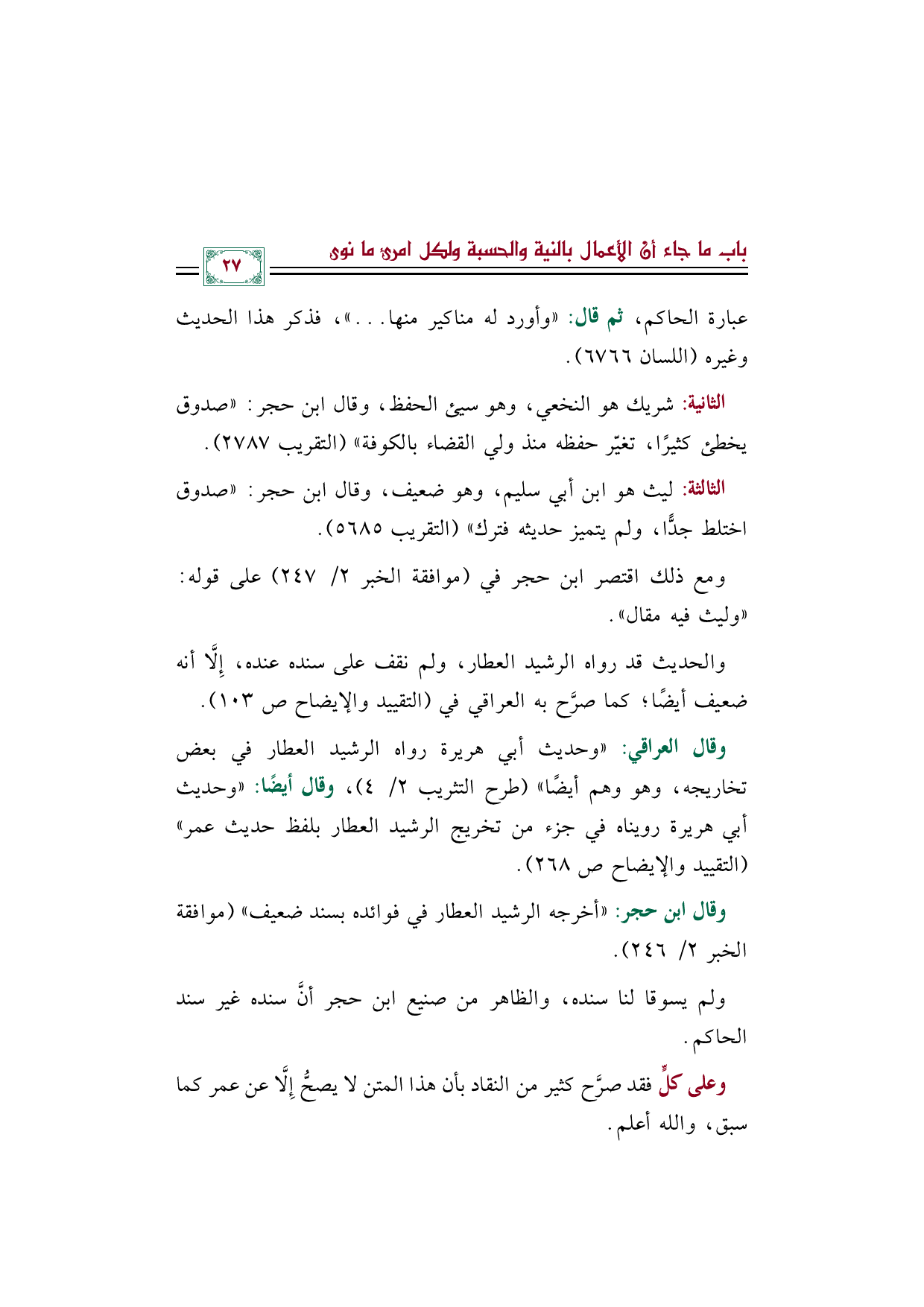 وقال العراقي: «وحديث أبي هريرة رواه الرشيد العطار في بعض تخاريجه، وهو وهم أيضًا» (طرح التثريب ٢/ ٤)، وقال أيضًا: «وحديث أبي هريرة رويناه في جزء من تخريج الرشيد العطار بلفظ حديث عمر» (التقييد والإيضاح ص ٢٦٨).