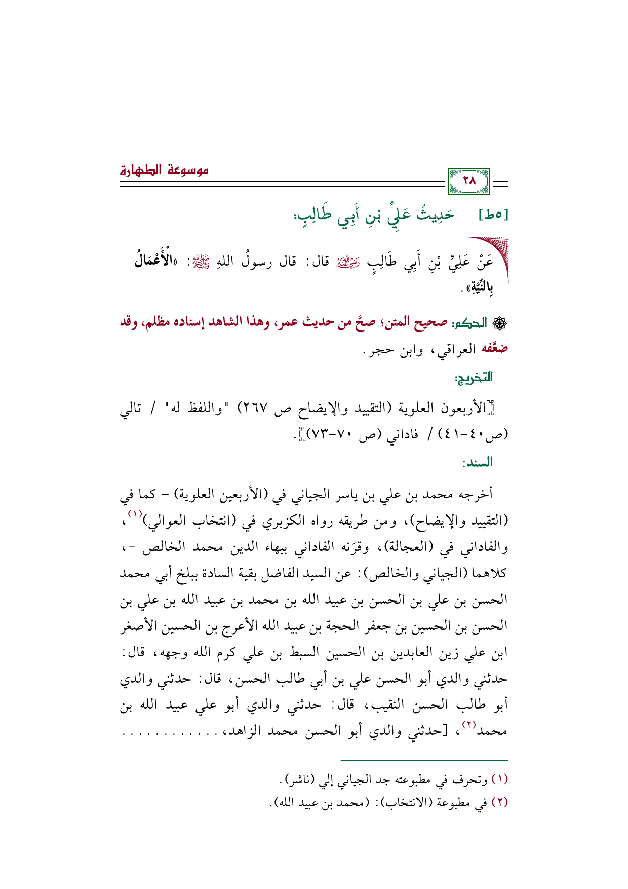 ◼ عَنْ عَلِيِّ بْنِ أَبِي طَالِبٍ رضي الله عنه قال: قال رسولُ اللهِ صلى الله عليه وسلم: «الْأَعْمَالُ بِالنِّيَّةِ».