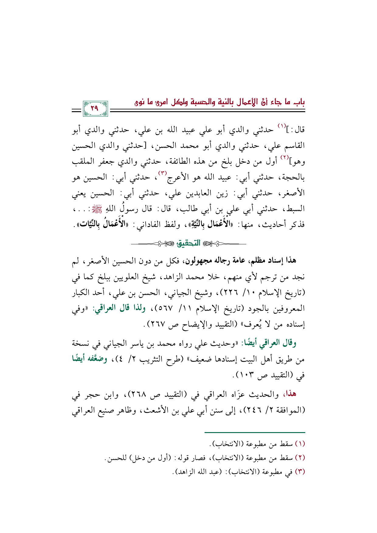 قال: ] (¬١) حدثني والدي أبو علي عبيدالله بن علي، حدثني والدي أبو القاسم علي، حدثني والدي أبو محمد الحسن، [حدثني والدي الحسين وهو] (¬٢) أول من دخل بلخ من هذه الطائفة، حدثني والدي جعفر الملقب بالحجة، حدثني أبي: عبيدالله هو الأعرج (¬٣)، حدثني أبي: الحسين هو الأصغر، حدثني أبي: زين العابدين علي، حدثني أبي: الحسين يعني السبط، حدثني أبي علي بن أبي طالب، قال: قال رسولُ اللهِ صلى الله عليه وسلم: .. ، فذكر أحاديث، منها: «الْأَعْمَال بِالنِّيَّةِ»، ولفظ الفاداني: «الْأَعْمَالُ بِالنِّيَّات».
