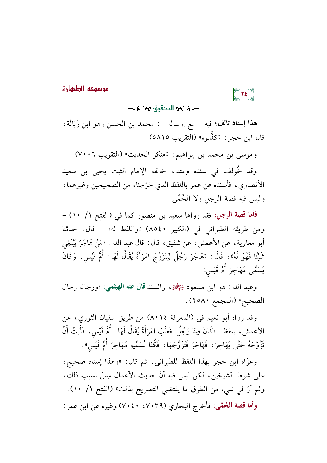 وقد رواه أبو نعيم في (المعرفة ٨٠١٤) من طريق سفيان الثوري، عن الأعمش، بلفظ: «كَانَ فِينَا رَجُلٌ خَطَبَ امْرَأَةً يُقَالُ لَهَا: أُمُّ قَيْسٍ، فَأَبَتْ أَنْ تَزَّوَّجَهُ حَتَّى يُهَاجِرَ، فَهَاجَرَ فَتَزَوَّجَهَا، فَكُنَّا نُسَمِّيهِ مُهَاجِرَ أُمِّ قَيْسٍ».
