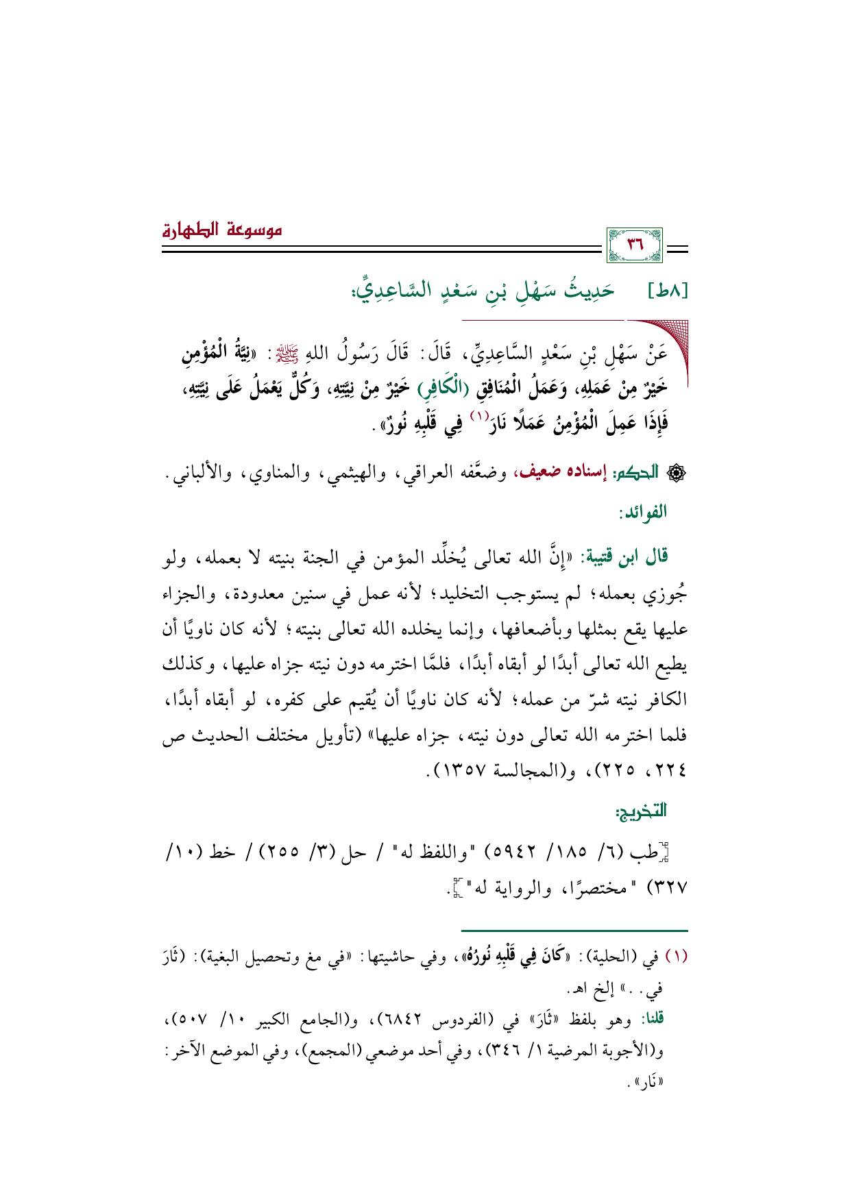(¬١) - في الحلية: «كَانَ فِي قَلْبِهِ نُورُهُ»، وفي حاشيتها: «في مغ وتحصيل البغية): (ثَارَ في .. » الخ اهـ. قلنا: وهو بلفظ «ثَارَ» في (الفردوس ٦٨٤٢)، و (الجامع الكبير ١٠/ ٥٠٧)، و (الأجوبة المرضية ١/ ٣٤٦)، وفي أحد موضعي (المجمع)، وفي الموضع الآخر: «نَار».
