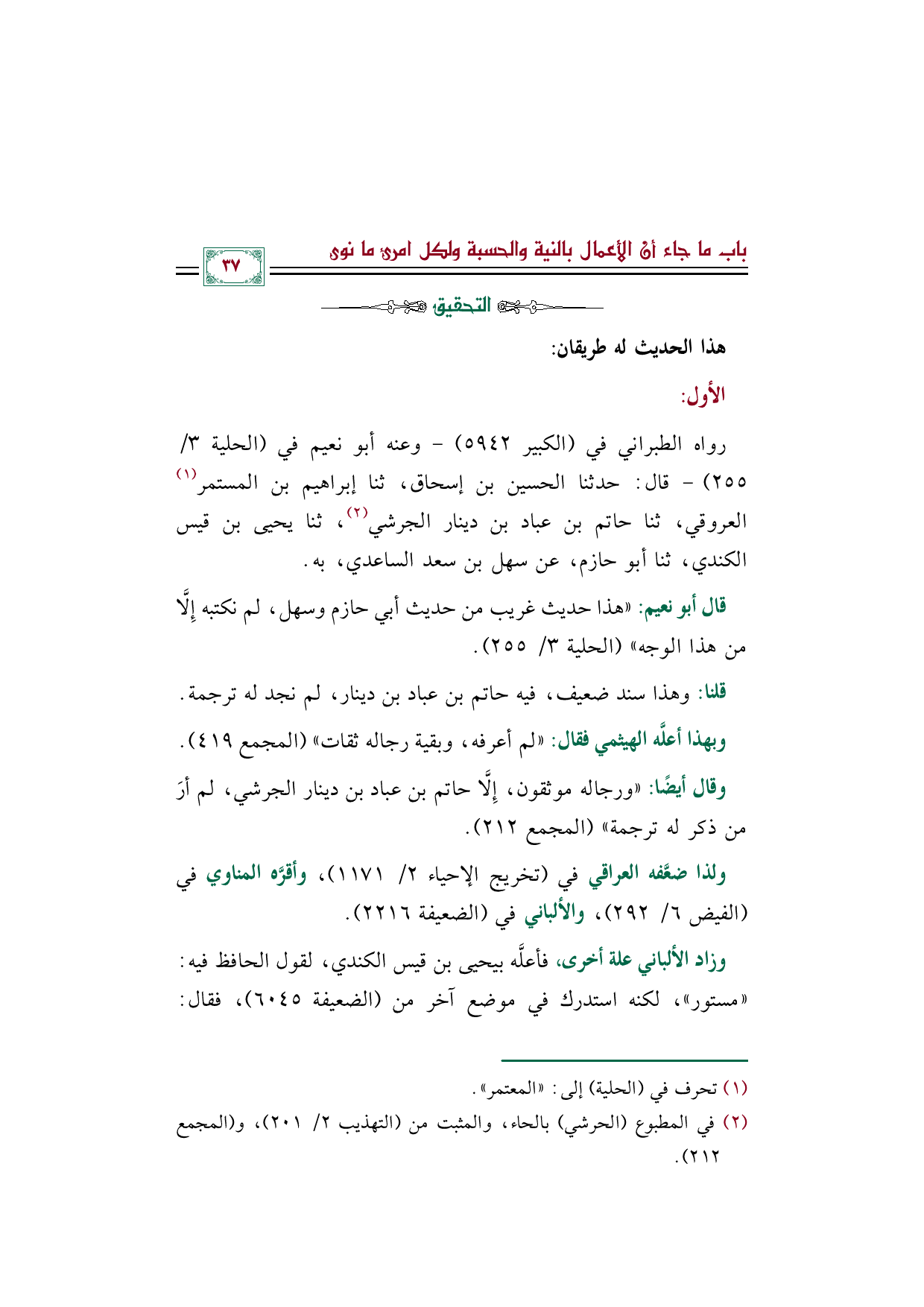 رواه الطبراني في (الكبير ٥٩٤٢) - وعنه أبو نعيم في (الحلية ٣/ ٢٥٥) - قال: حدثنا الحسين بن إسحاق، ثنا إبراهيم بن المستمر (¬١) العروقي، ثنا حاتم بن عباد بن دينار الجرشي (¬٢)، ثنا يحيى بن قيس الكندي، ثنا أبو حازم، عن سهل بن سعد الساعدي، به.