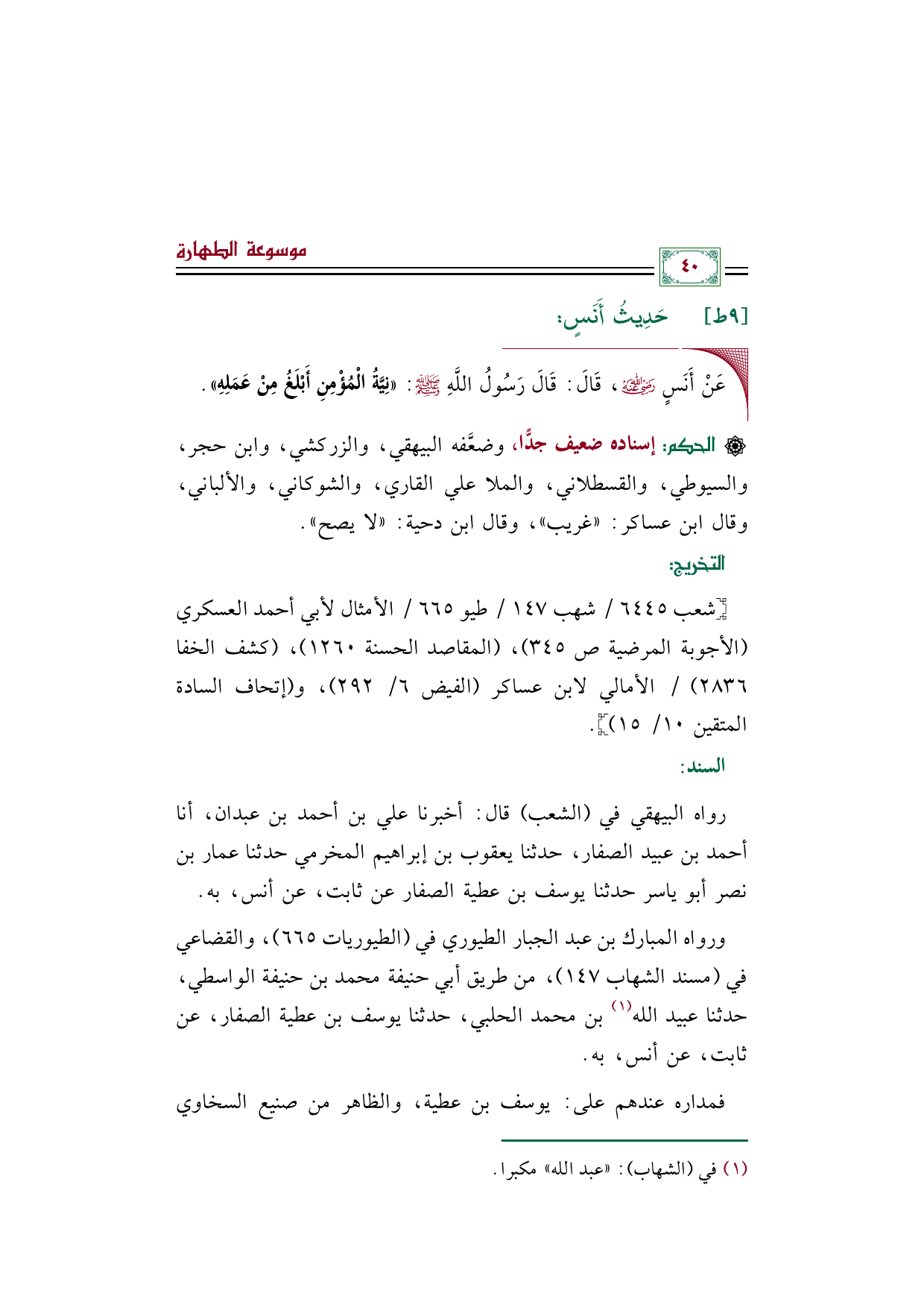 ◼ عَنْ أَنَسٍ رضي الله عنه، قَالَ: قَالَ رَسُولُ اللَّهِ صلى الله عليه وسلم: «نِيَّةُ الْمُؤْمِنِ أَبْلَغُ مِنْ عَمَلِهِ».